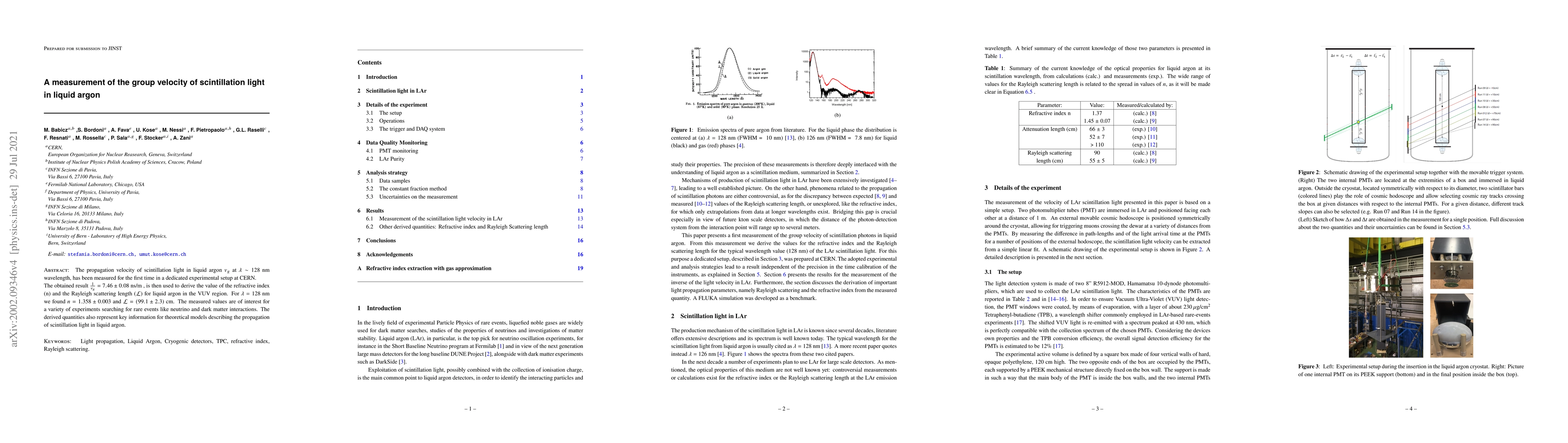 The propagation velocity of scintillation light in liquid argon $v_{g}$ at $\lambda \sim 128$~nm wavelength, has been measured for the first time in a dedicated experimental setup at CERN.\\ The obtained result $\frac{1}{v_{g}} = 7.46 \pm 0.08$~ns/m , is then used to derive the value of the refractive index (n) and the Rayleigh scattering length ($\mathcal{L}$) for liquid argon in the VUV region. For $\lambda = 128$~nm we found $n= 1.358 \pm 0.003$ and $\mathcal{L}= 99.1 \pm 2.3$~cm. The measured values are of interest for a variety of experiments searching for rare events like neutrino and dark matter interactions. The derived quantities also represent key information for theoretical models describing the propagation of scintillation light in liquid argon.
