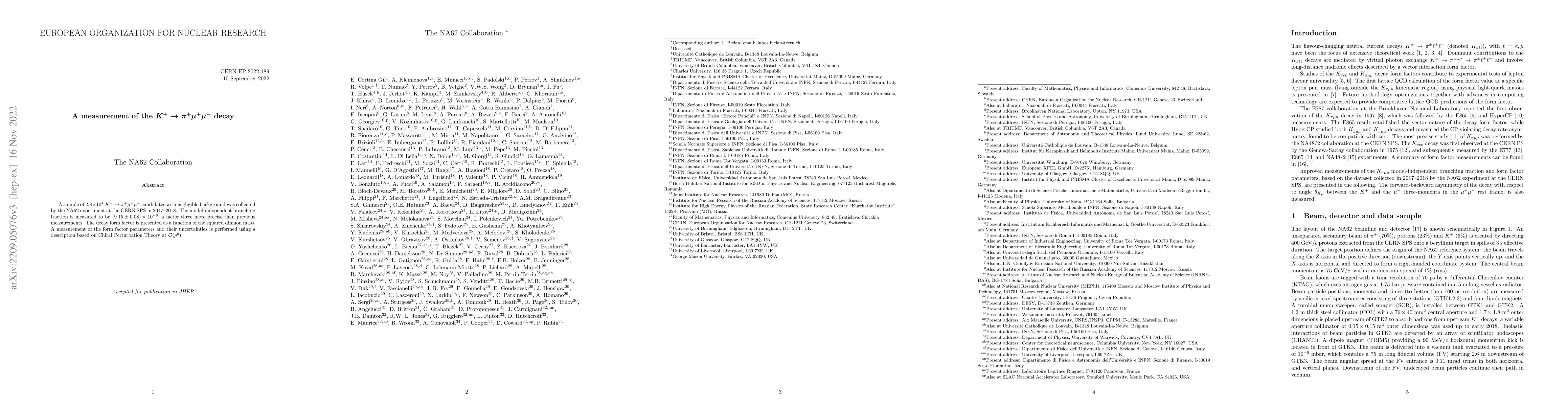 The NA62 experiment at CERN SPS measured the branching fraction of the $K^{+} \to \pi^{+} \mu^{+} \mu^{-}$ decay with high precision as $(9.15 \pm 0.08)\times 10^{-8}$, significantly improving previous results. The study also presents the decay form factor and its parameters using Chiral Perturbation Theory.