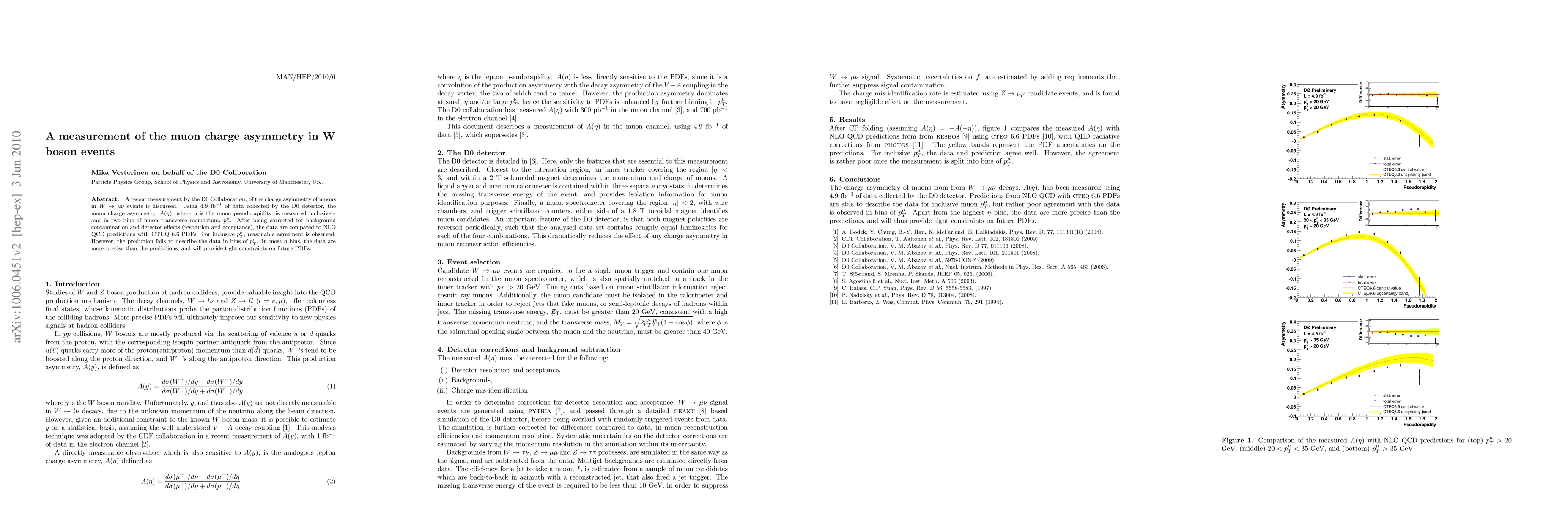 A recent measurement by the D0 Collaboration, of the charge asymmetry of muons in $W\rightarrow\mu\nu$ events is discussed. Using 4.9 fb$^{-1}$ of data collected by the D0 detector, the muon charge asymmetry, $A(\eta)$, where $\eta$ is the muon pseudorapidity, is measured inclusively and in two bins of muon transverse momentum, \ptmu. After being corrected for background contamination and detector effects (resolution and acceptance), the data are compared to NLO QCD predictions with CTEQ 6.6 PDFs. For inclusive \ptmu, reasonable agreement is observed. However, the prediction fails to describe the data in bins of \ptmu. In most $\eta$ bins, the data are more precise than the predictions, and will provide tight constraints on future PDFs.