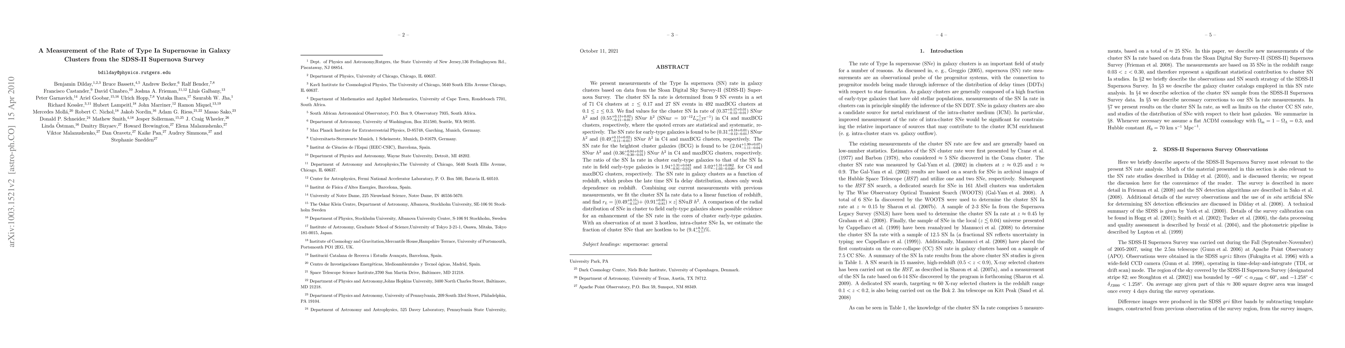 This study measures the Type Ia supernova rate in galaxy clusters using SDSS-II data, finding rates of 0.37 SNUr h² and 0.55 SNUr h² in C4 and maxBCG clusters, respectively. The research also indicates a weak redshift dependence and possible enhancement of supernova rates in cluster galaxy cores.