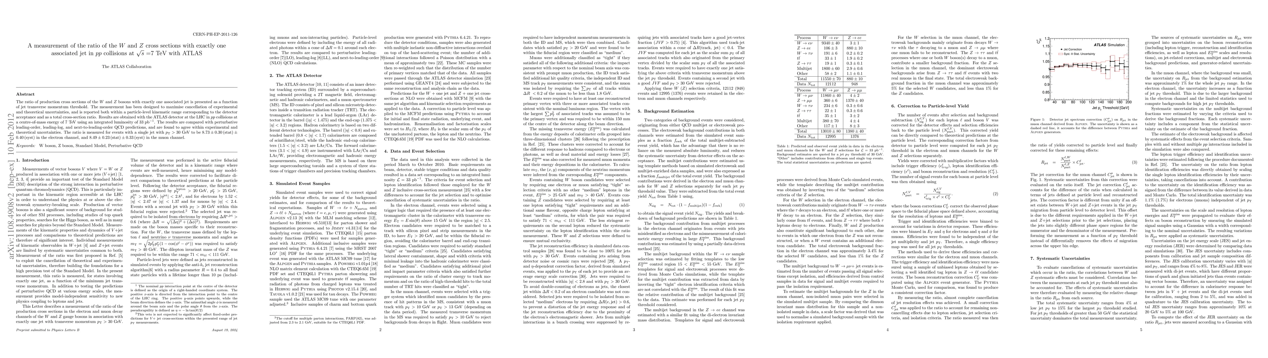 The ATLAS detector measured the ratio of W and Z boson production cross sections with exactly one associated jet in 7 TeV pp collisions, agreeing with QCD predictions within uncertainties.