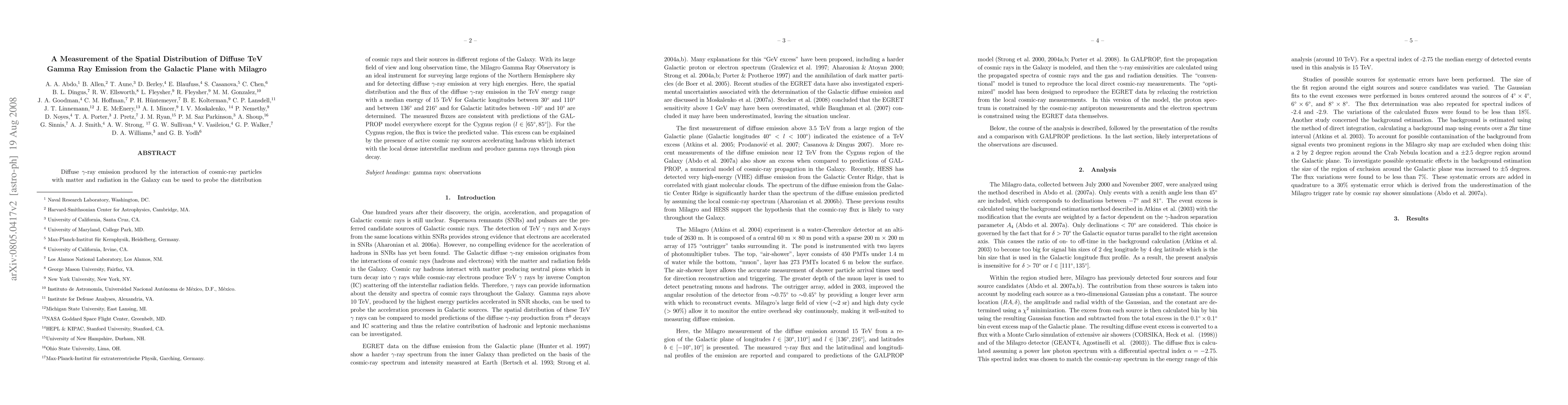 Diffuse $\gamma$-ray emission produced by the interaction of cosmic-ray particles with matter and radiation in the Galaxy can be used to probe the distribution of cosmic rays and their sources in different regions of the Galaxy. With its large field of view and long observation time, the Milagro Gamma Ray Observatory is an ideal instrument for surveying large regions of the Northern Hemisphere sky and for detecting diffuse $\gamma$-ray emission at very high energies. Here, the spatial distribution and the flux of the diffuse $\gamma$-ray emission in the TeV energy range with a median energy of 15 TeV for Galactic longitudes between 30$^\circ$ and 110$^\circ$ and between 136$^\circ$ and 216$^\circ$ and for Galactic latitudes between -10$^\circ$ and 10$^\circ$ are determined. The measured fluxes are consistent with predictions of the GALPROP model everywhere except for the Cygnus region ($l\in[65^\circ,85^\circ]$). For the Cygnus region, the flux is twice the predicted value. This excess can be explained by the presence of active cosmic ray sources accelerating hadrons which interact with the local dense interstellar medium and produce gamma rays through pion decay.