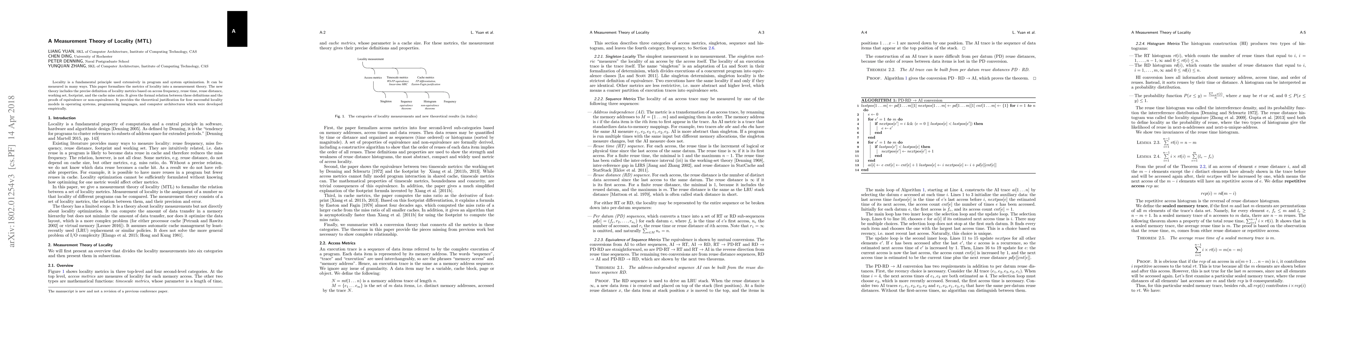 Locality is a fundamental principle used extensively in program and system optimization. It can be measured in many ways. This paper formalizes the metrics of locality into a measurement theory. The new theory includes the precise definition of locality metrics based on access frequency, reuse time, reuse distance, working set, footprint, and the cache miss ratio. It gives the formal relation between these definitions and the proofs of equivalence or non-equivalence. It provides the theoretical justification for four successful locality models in operating systems, programming languages, and computer architectures which were developed empirically.