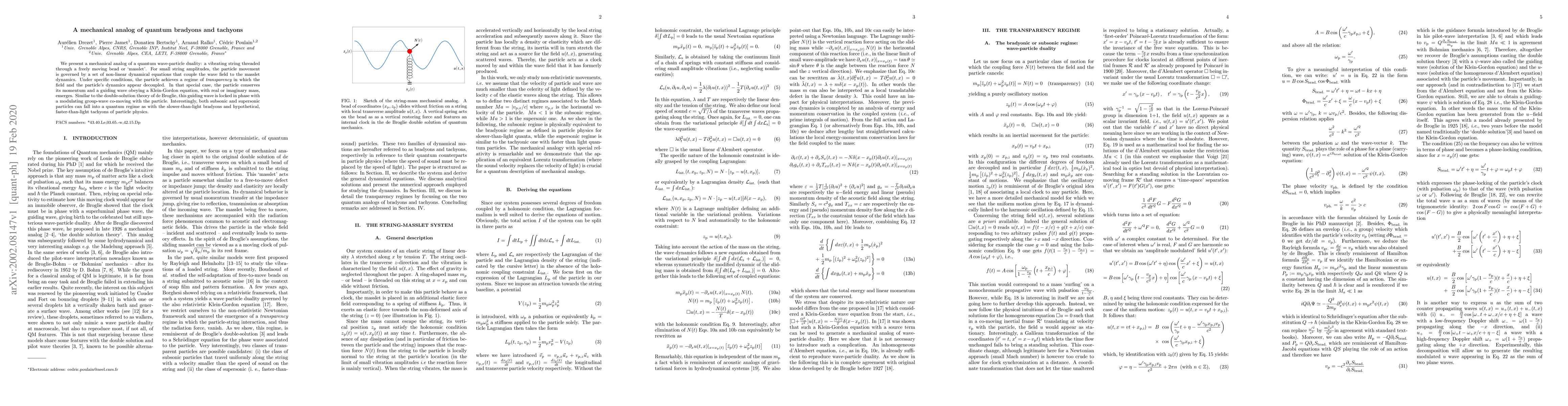 We present a mechanical analog of a quantum wave-particle duality: a vibrating string threaded through a freely moving bead or `masslet'. For small string amplitudes, the particle movement is governed by a set of non-linear dynamical equations that couple the wave field to the masslet dynamics. Under specific conditions, the particle achieves a regime of {\it transparency} in which the field and the particle's dynamics appear decoupled. In that special case, the particle conserves its momentum and a guiding wave obeying a Klein-Gordon equation, with real or imaginary mass, emerges. Similar to the double-solution theory of de Broglie, this guiding wave is locked in phase with a modulating group-wave co-moving with the particle. Interestingly, both subsonic and supersonic particles can fall into a quantum regime as with the slower-than-light bradyons and hypothetical, faster-than-light tachyons of particle physics.