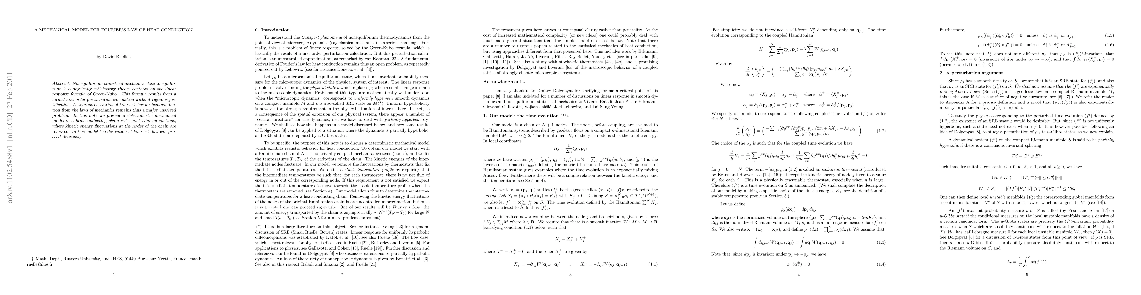 Nonequilibrium statistical mechanics close to equilibrium is a physically satisfactory theory centered on the linear response formula of Green-Kubo. This formula results from a formal first order perturbation calculation without rigorous justification. A rigorous derivation of Fourier's law for heat conduction from the laws of mechanics remains thus a major unsolved problem. In this note we present a deterministic mechanical model of a heat-conducting chain with nontrivial interactions, where kinetic energy fluctuations at the nodes of the chain are removed. In this model the derivation of Fourier's law can proceed rigorously.