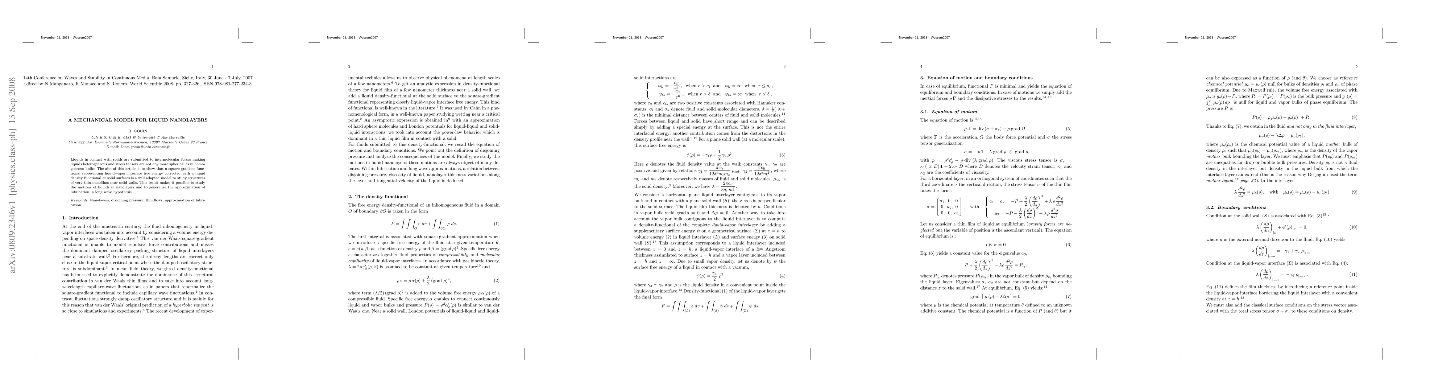 Liquids in contact with solids are submitted to intermolecular forces making liquids heterogeneous and stress tensors are not any more spherical as in homogeneous bulks. The aim of this article is to show that a square-gradient functional representing liquid-vapor interface free energy corrected with a liquid density functional at solid surfaces is a well adapted model to study structures of very thin nanofilms near solid walls. This result makes it possible to study the motions of liquids in nanolayers and to generalize the approximation of lubrication in long wave hypothesis.