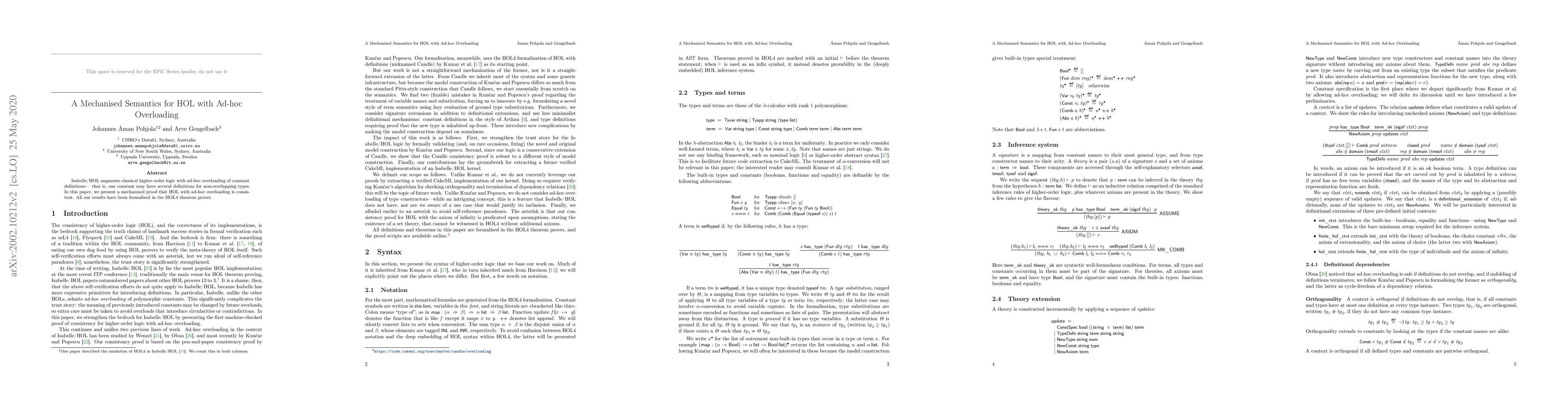 This paper presents a mechanised proof confirming the consistency of higher-order logic (HOL) extended with ad-hoc overloading, where a constant can have multiple definitions for different types. The results were formalised in the HOL4 theorem prover.