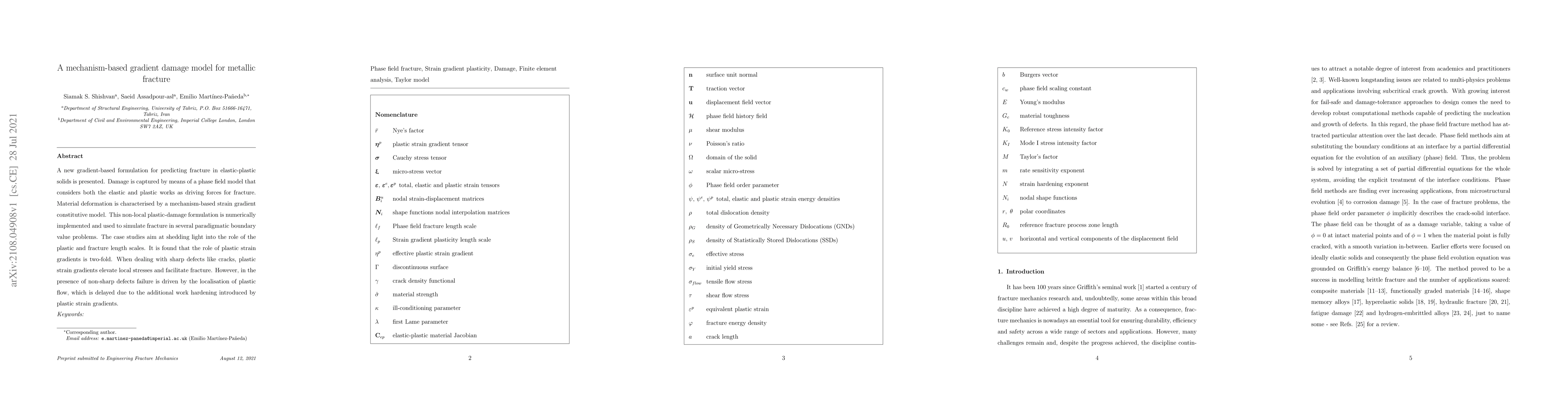 This paper introduces a gradient-based gradient damage model for predicting fracture in elastic-plastic solids, using a phase field approach that considers both elastic and plastic work. The model delays failure in non-sharp defects by work hardening, while sharp defects like cracks are facilitated by elevated local stresses due to plastic strain gradients.