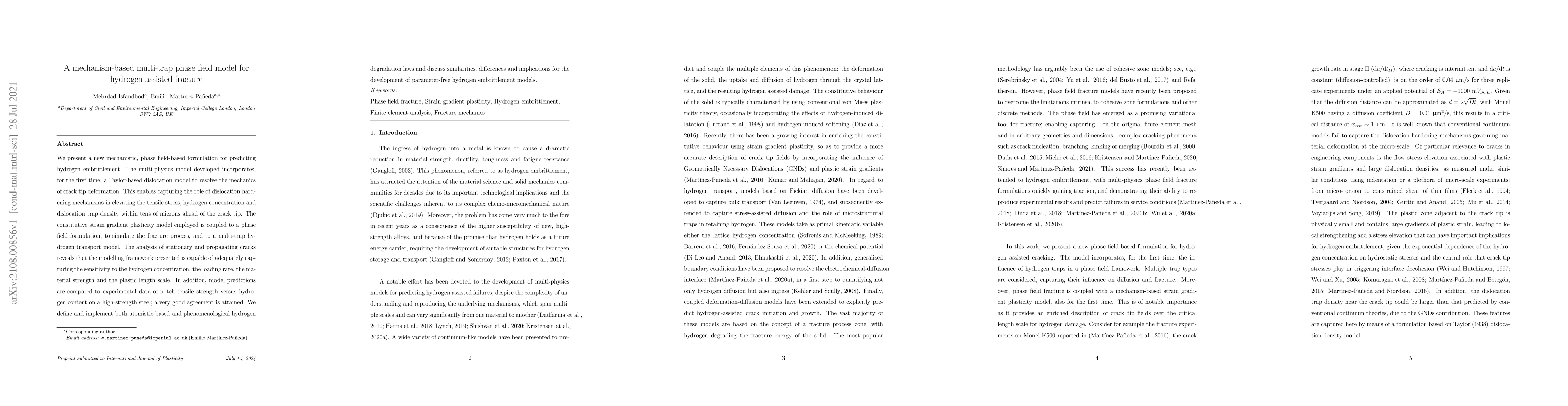 We present a new mechanistic, phase field-based formulation for predicting hydrogen embrittlement. The multi-physics model developed incorporates, for the first time, a Taylor-based dislocation model to resolve the mechanics of crack tip deformation. This enables capturing the role of dislocation hardening mechanisms in elevating the tensile stress, hydrogen concentration and dislocation trap density within tens of microns ahead of the crack tip. The constitutive strain gradient plasticity model employed is coupled to a phase field formulation, to simulate the fracture process, and to a multi-trap hydrogen transport model. The analysis of stationary and propagating cracks reveals that the modelling framework presented is capable of adequately capturing the sensitivity to the hydrogen concentration, the loading rate, the material strength and the plastic length scale. In addition, model predictions are compared to experimental data of notch tensile strength versus hydrogen content on a high-strength steel; a very good agreement is attained. We define and implement both atomistic-based and phenomenological hydrogen degradation laws and discuss similarities, differences and implications for the development of parameter-free hydrogen embrittlement models.