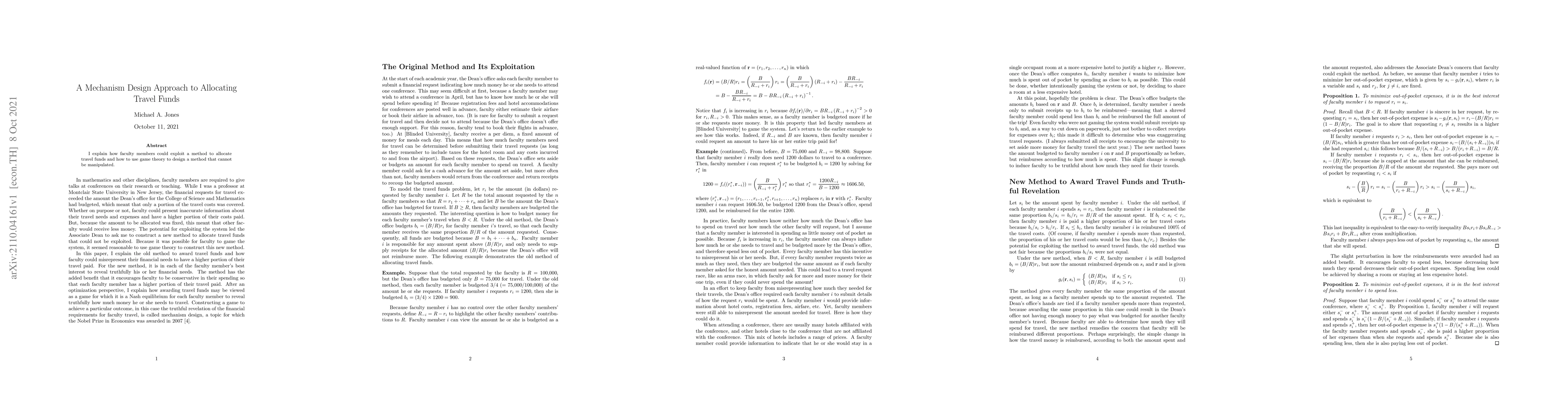 The paper proposes a game theory-based mechanism design to prevent manipulation in travel fund allocation among faculty members, ensuring fair distribution.