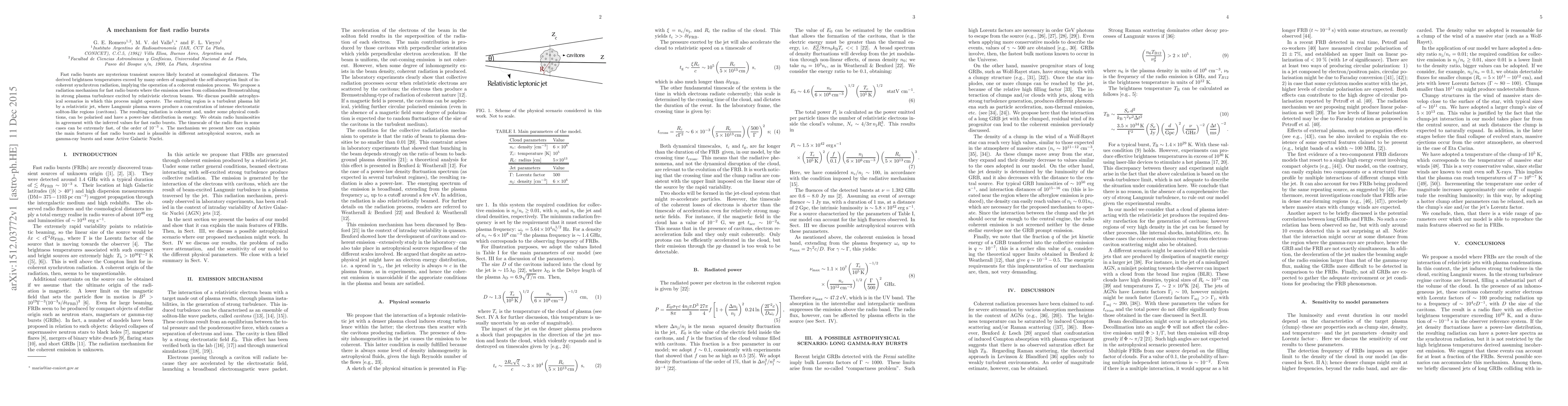 This paper proposes a mechanism for fast radio bursts involving collisionless Bremsstrahlung in strong plasma turbulence driven by relativistic electron beams, suggesting that the emission arises from cavitons in turbulent plasma hit by a relativistic jet. The model explains the bursts' high brightness and fast timescale, and is applicable to astrophysical scenarios like gamma-ray bursts and Active Galactic Nuclei.