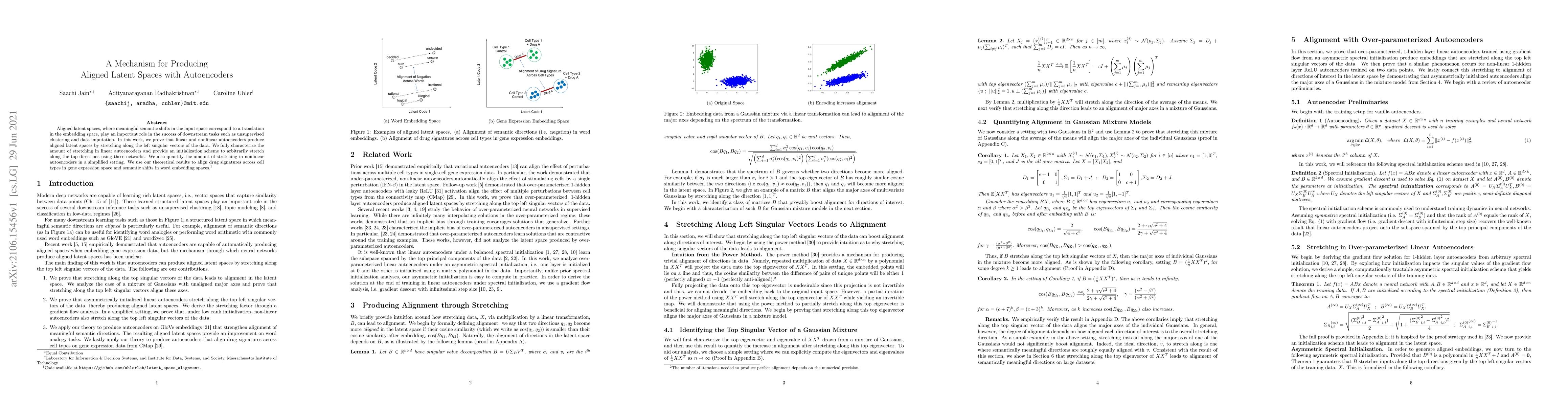 This paper demonstrates that both linear and nonlinear autoencoders can produce aligned latent spaces by stretching along the left singular vectors of the data. The authors provide a theoretical framework to quantify and manipulate this alignment, which is then applied to align drug signatures across cell types and semantic shifts in word embeddings.