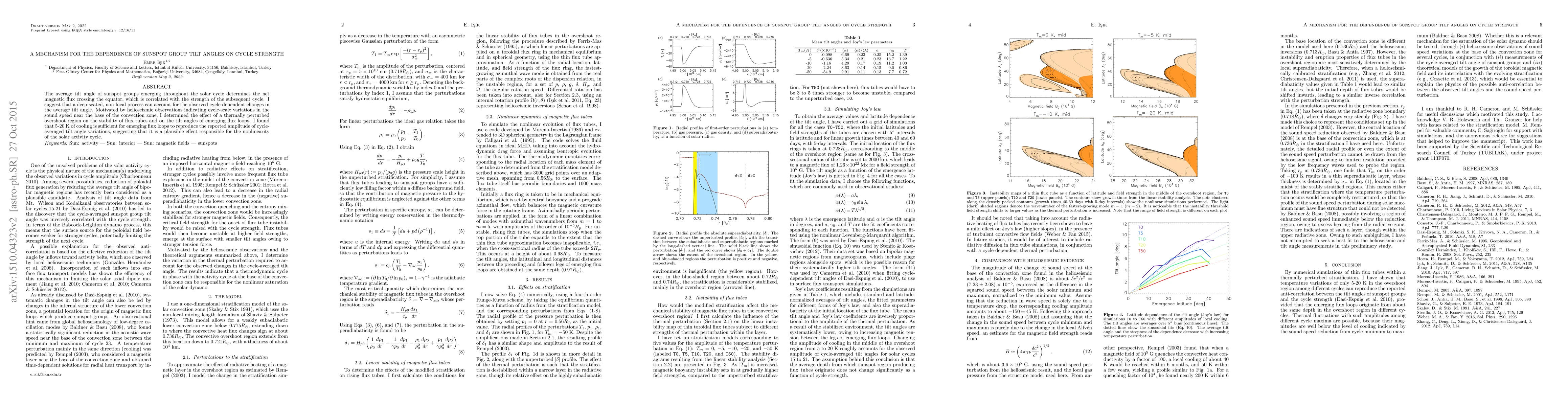 This paper proposes a deep-seated, non-local mechanism explaining the dependence of sunspot group tilt angles on solar cycle strength, suggesting that thermally perturbed overshoot regions can influence flux tube stability and tilt angles, with 5-20 K of cooling sufficient to reproduce observed variations.