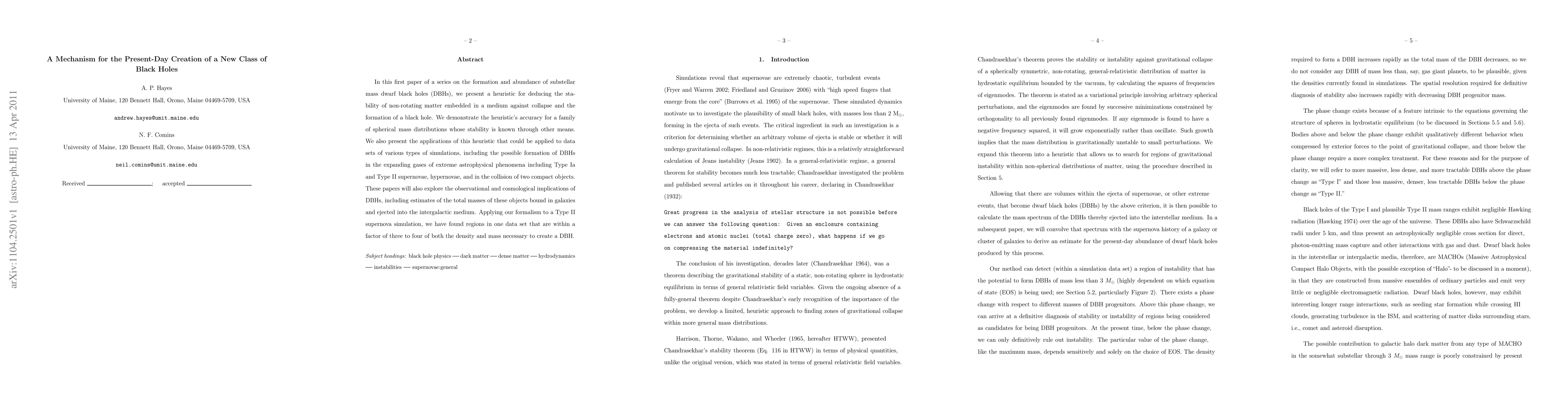In this first paper of a series on the formation and abundance of substellar mass dwarf black holes (DBHs), we present a heuristic for deducing the stability of non-rotating matter embedded in a medium against collapse and the formation of a black hole. We demonstrate the heuristic's accuracy for a family of spherical mass distributions whose stability is known through other means. We also present the applications of this heuristic that could be applied to data sets of various types of simulations, including the possible formation of DBHs in the expanding gases of extreme astrophysical phenomena including Type Ia and Type II supernovae, hypernovae, and in the collision of two compact objects. These papers will also explore the observational and cosmological implications of DBHs, including estimates of the total masses of these objects bound in galaxies and ejected into the intergalactic medium. Applying our formalism to a Type II supernova simulation, we have found regions in one data set that are within a factor of three to four of both the density and mass necessary to create a DBH.