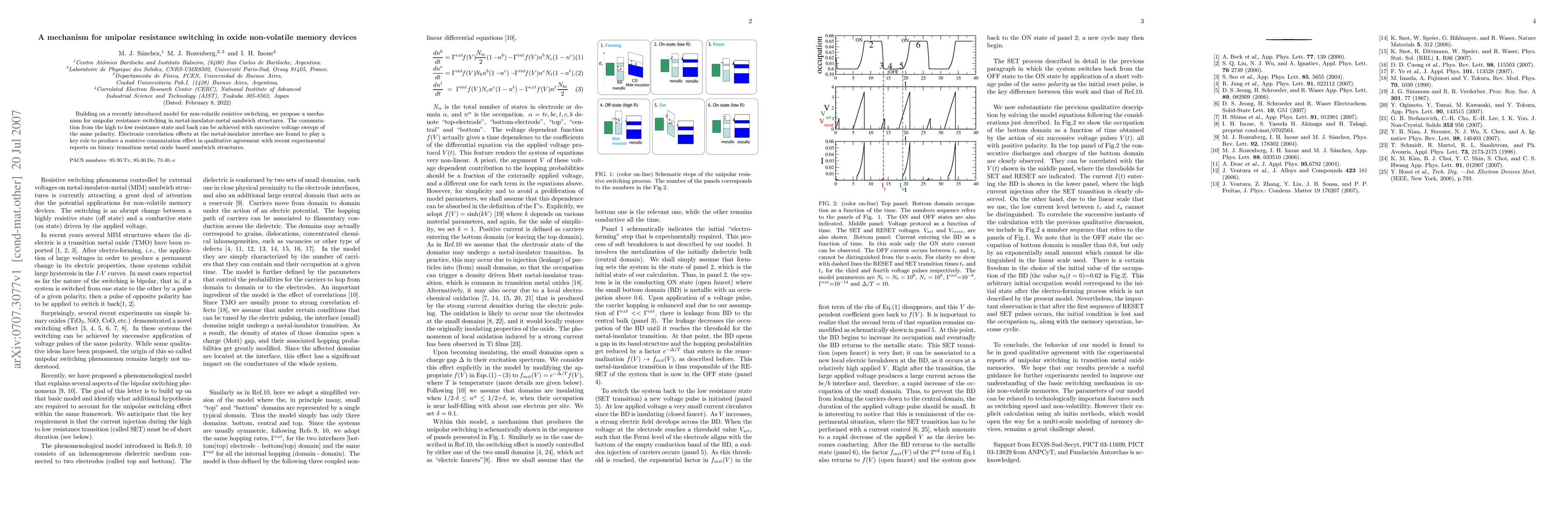 Summary: This paper proposes a mechanism for unipolar resistance switching in metal-insulator-metal sandwich structures, attributing the resistive commutation effect to electronic correlation effects at the metal-insulator interface, in agreement with recent experimental findings on binary transition metal oxide devices.