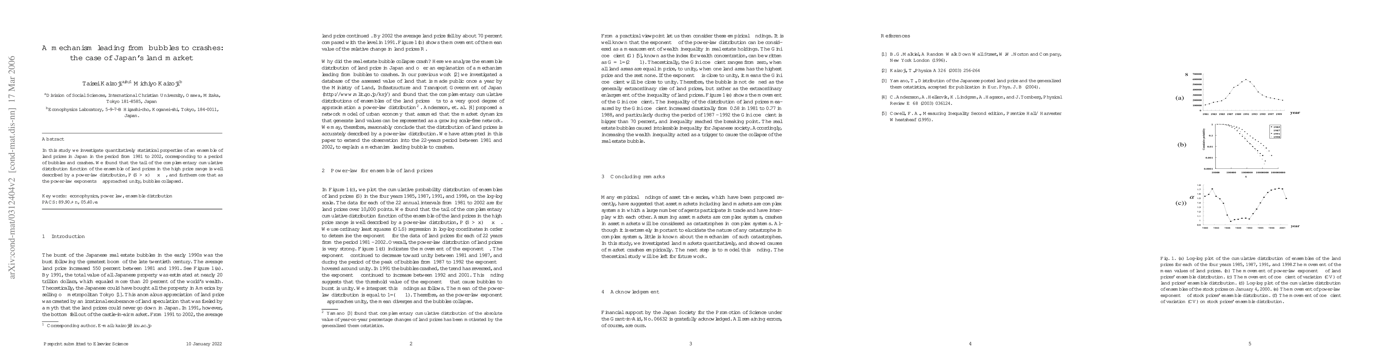 In this paper we investigate quantitatively statistical properties of ensemble of {\it land prices} in Japan in the period from 1981 to 2002, corresponding to the period of bubbles and crashes. We find that the tail of the distributions of ensembles of the land prices in the high price range is well described by a power law distribution, $ P(S>x) \sim x^{-\alpha} $, and furthermore that as the power-law exponents $ \alpha $ approached to unity, the crashes of bubbles occurred.