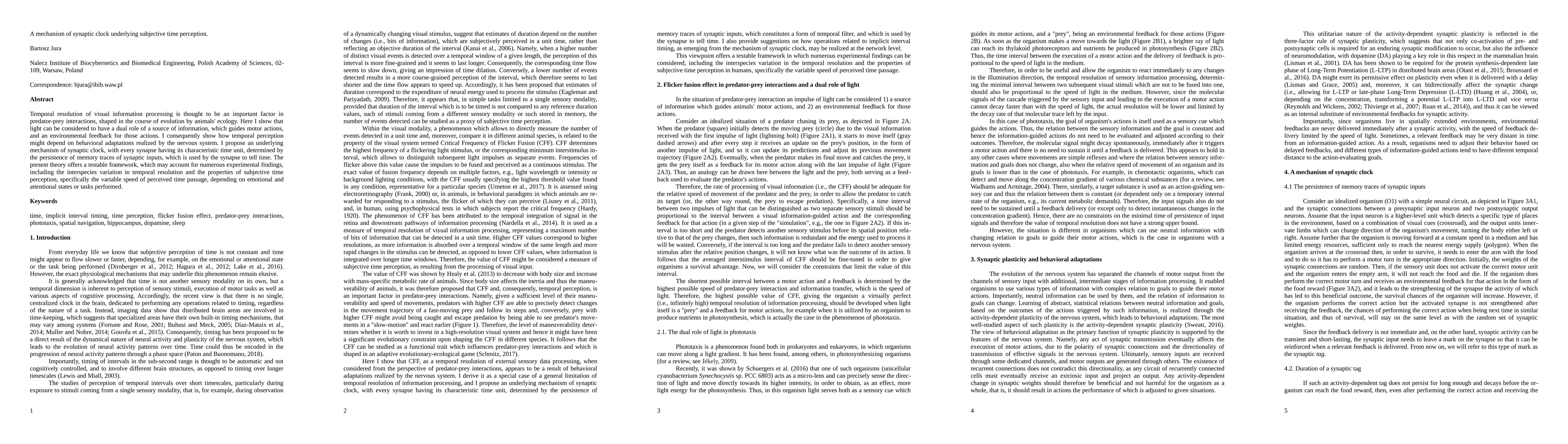 Temporal resolution of visual information processing is thought to be an important factor in predator-prey interactions, shaped in the course of evolution by animals' ecology. Here I show that light can be considered to have a dual role of a source of information, which guides motor actions, and an environmental feedback for those actions. I consequently show how temporal perception might depend on behavioral adaptations realized by the nervous system. I propose an underlying mechanism of synaptic clock, with every synapse having its characteristic time unit, determined by the persistence of memory traces of synaptic inputs, which is used by the synapse to tell time. The present theory offers a testable framework, which may account for numerous experimental findings, including the interspecies variation in temporal resolution and the properties of subjective time perception, specifically the variable speed of perceived time passage, depending on emotional and attentional states or tasks performed.