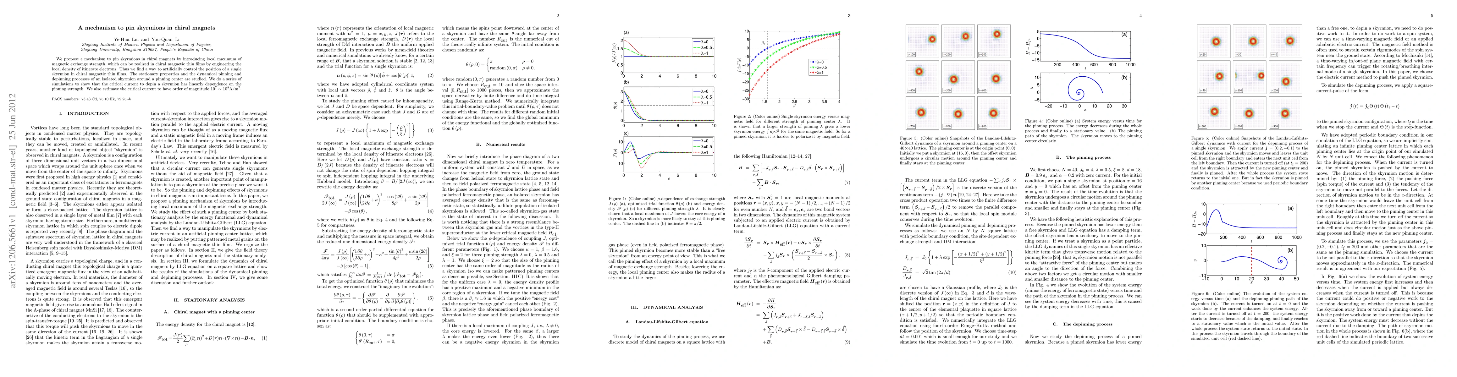 This paper proposes a method to pin skyrmions in chiral magnets by creating local maxima in magnetic exchange strength, achievable through engineered local density of itinerant electrons in thin films. Simulations demonstrate that the critical current to depin a skyrmion linearly depends on the pinning strength, with estimated values in the range of \(10^{7}\sim10^{8}\text{A/m}^{2}\).