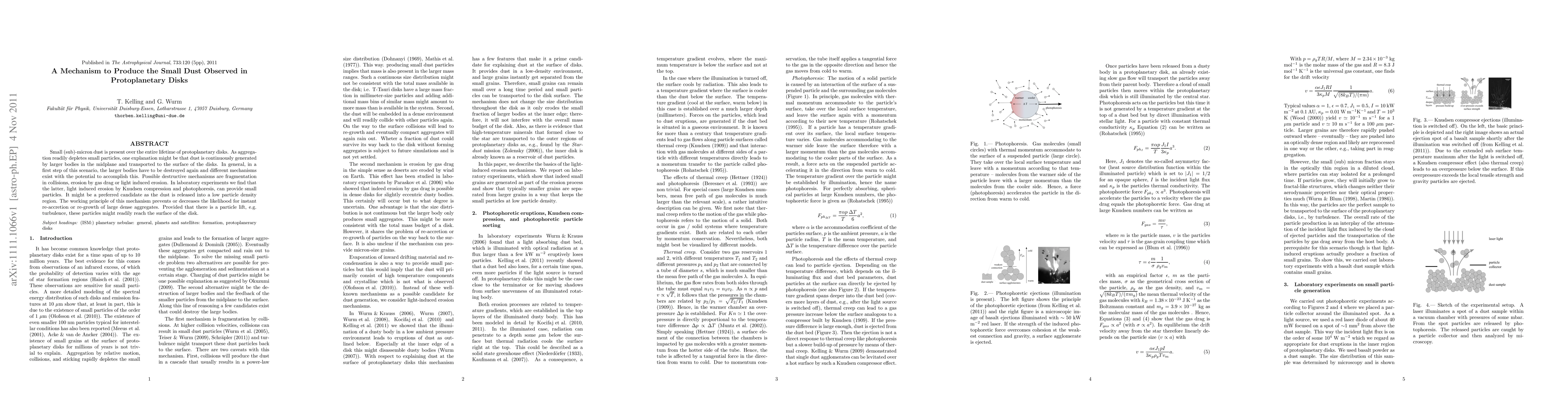 Small (sub)-micron dust is present over the entire lifetime of protoplanetary disks. As aggregation readily depletes small particles, one explanation might be that dust is continuously generated by larger bodies in the midplane and transported to the surface of the disks. In general, in a first step of this scenario, the larger bodies have to be destroyed again and different mechanisms exist with the potential to accomplish this. Possible destructive mechanisms are fragmentation in collisions, erosion by gas drag or light induced erosion. In laboratory experiments we find that the latter, light induced erosion by Knudsen compression and photophoresis, can provide small particles. It might be a preferred candidate as the dust is released into a low particle density region. The working principle of this mechanism prevents or decreases the likelihood for instant re-accretion or re-growth of large dense aggregates. Provided that there is a particle lift, e.g. turbulence, these particles might readily reach the surface of the disk.