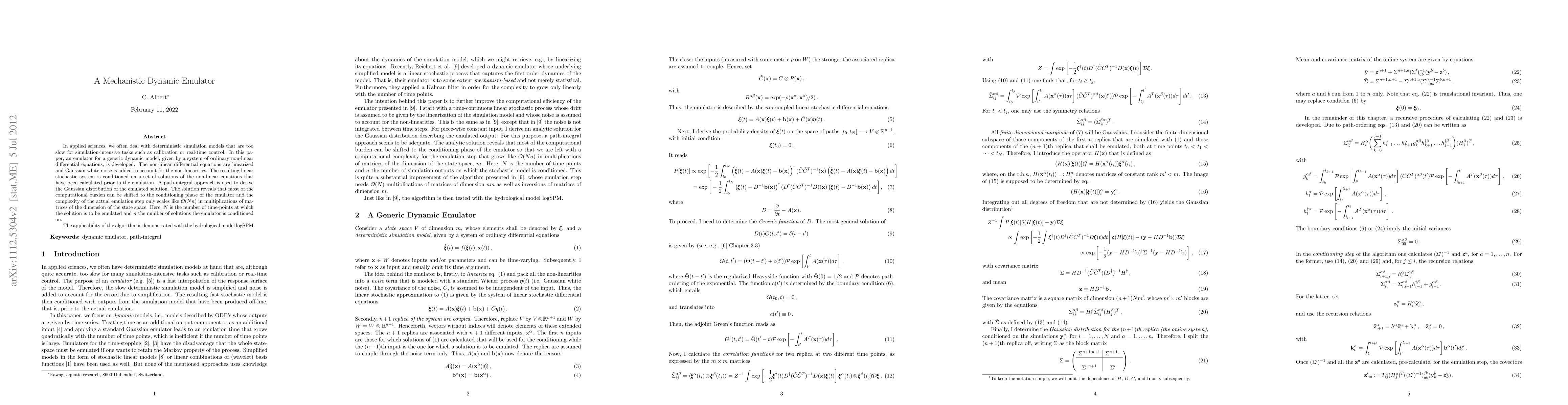In applied sciences, we often deal with deterministic simulation models that are too slow for simulation-intensive tasks such as calibration or real-time control. In this paper, an emulator for a generic dynamic model, given by a system of ordinary non-linear differential equations, is developed. The non-linear differential equations are linearized and Gaussian white noise is added to account for the non-linearities. The resulting linear stochastic system is conditioned on a set of solutions of the non-linear equations that have been calculated prior to the emulation. A path-integral approach is used to derive the Gaussian distribution of the emulated solution. The solution reveals that most of the computational burden can be shifted to the conditioning phase of the emulator and the complexity of the actual emulation step only scales like $\mathcal O(Nn)$ in multiplications of matrices of the dimension of the state space. Here, $N$ is the number of time-points at which the solution is to be emulated and $n$ the number of solutions the emulator is conditioned on. The applicability of the algorithm is demonstrated with the hydrological model logSPM.