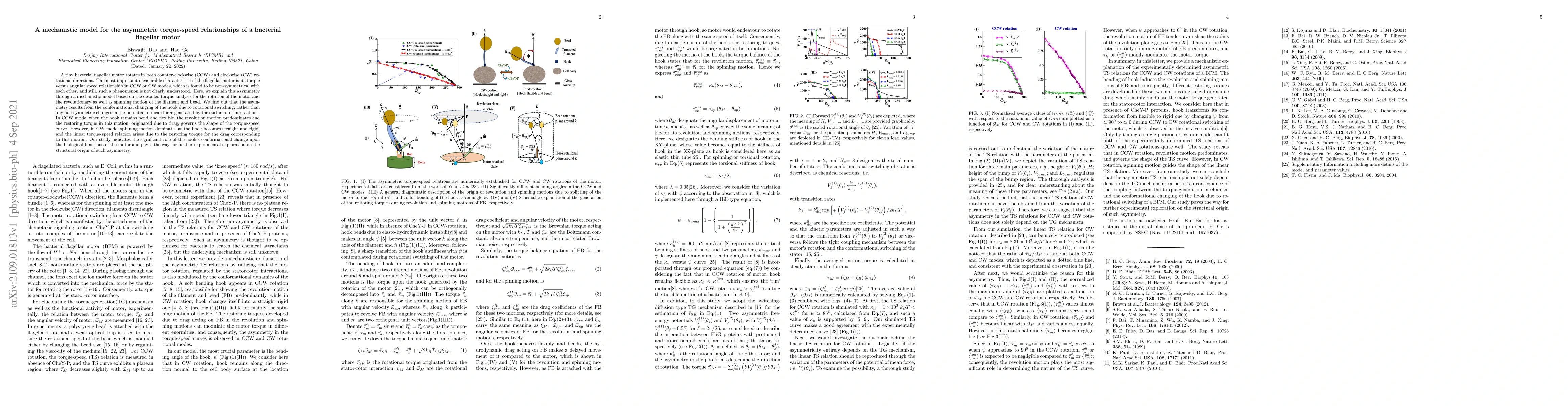 This paper proposes a mechanistic model explaining the asymmetric torque-speed relationships of bacterial flagellar motors, attributing the asymmetry to conformational changes in the hook due to rotational switching, rather than non-symmetric stator-rotor interactions. The model highlights the differing roles of revolution and spinning motions in clockwise and counter-clockwise modes.