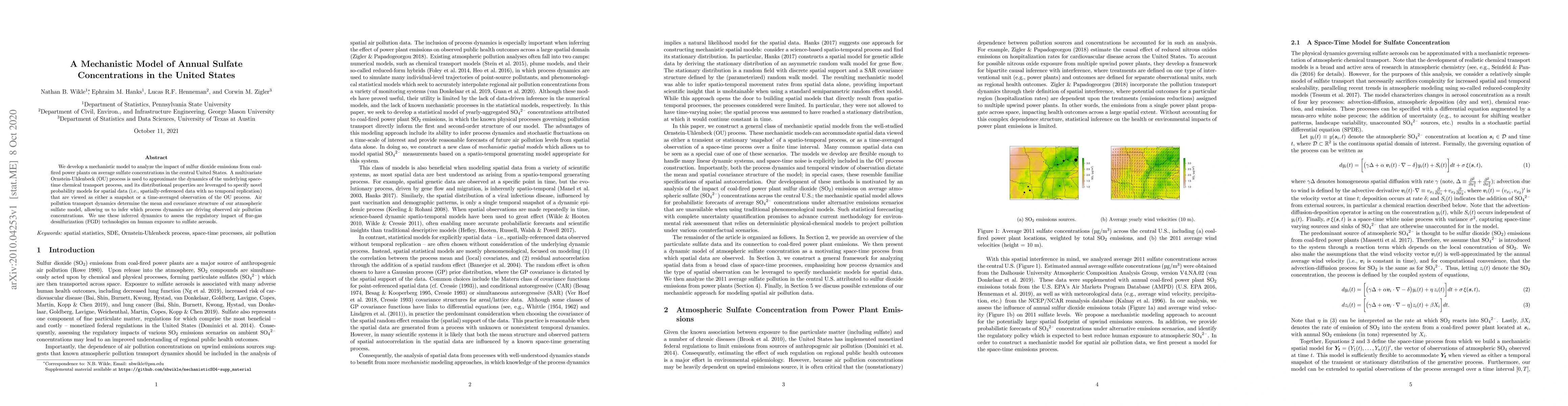 A mechanistic model analyzes the impact of sulfur dioxide emissions on sulfate concentrations in the US, using a multivariate Ornstein-Uhlenbeck process to approximate atmospheric transport dynamics. The model helps assess the regulatory impact of flue-gas desulfurization technologies on human exposure to sulfate aerosols.