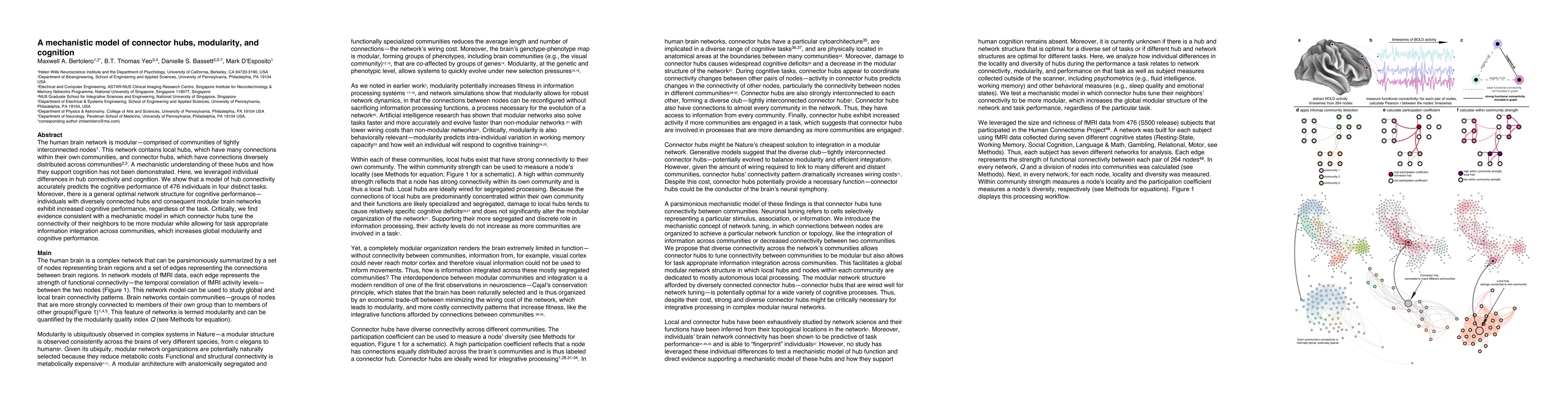 This research develops a mechanistic model explaining how connector hubs in the brain's modular network enhance cognition by tuning local connectivity for optimal information integration across communities, leading to improved performance across various tasks. The model accurately predicts the cognitive performance of 476 individuals.
