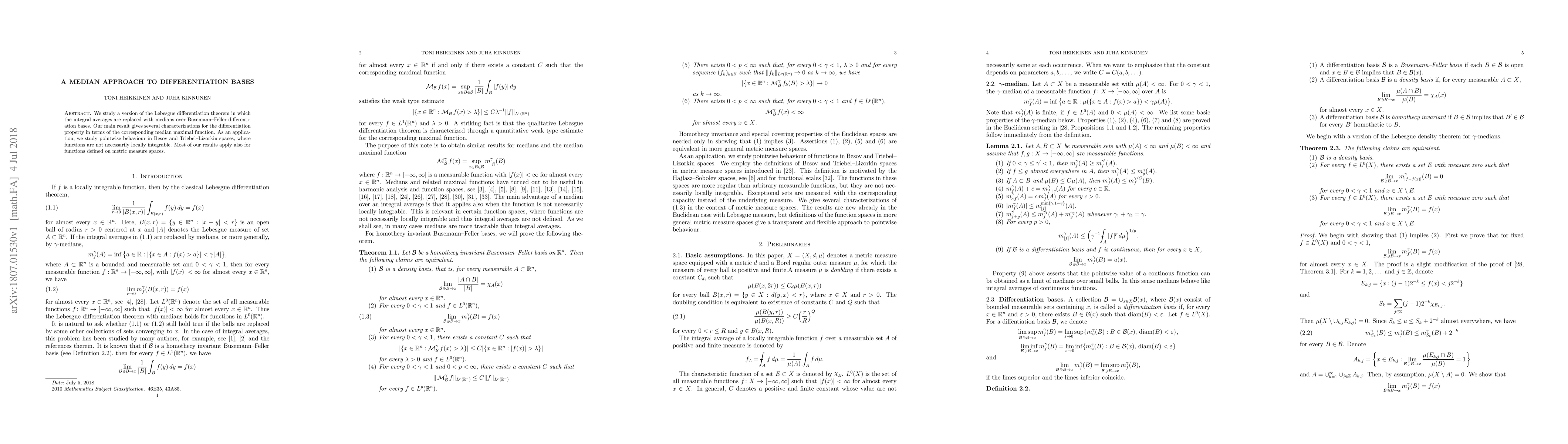 This research paper explores a new approach to differentiation using medians over Busemann-Feller bases, providing characterizations of the differentiation property in terms of median maximal functions. The results apply to Besov and Triebel-Lizorkin spaces, even for non-locally integrable functions on metric measure spaces.