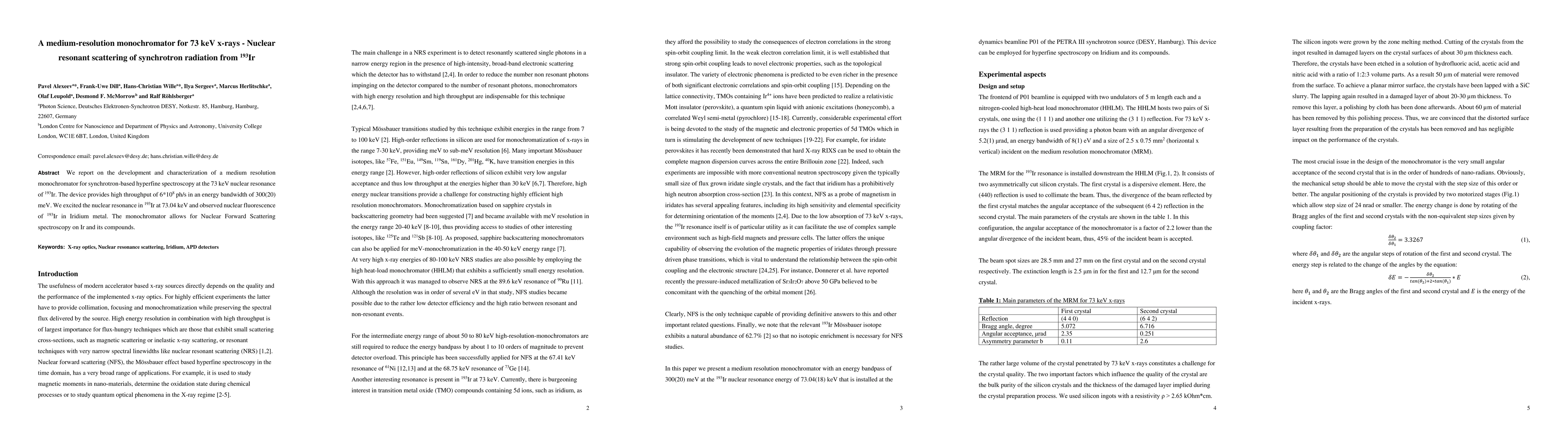 This paper details the development of a medium-resolution monochromator for 73 keV x-rays, enabling high-throughput hyperfine spectroscopy at the nuclear resonance of 193-Ir. The device successfully observes nuclear fluorescence in Iridium metal, facilitating Nuclear Forward Scattering spectroscopy.