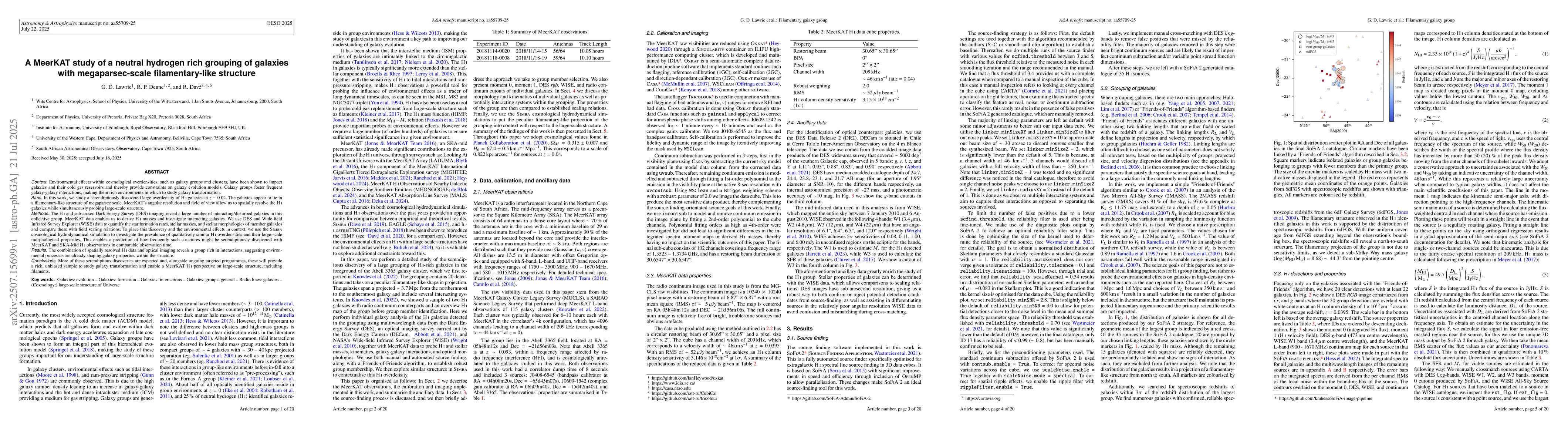 Environmental effects within cosmological overdensities, such as galaxy groups and clusters, have been shown to impact galaxies and their cold gas reservoirs and thereby provide constraints on galaxy evolution models. Galaxy groups foster frequent galaxy-galaxy interactions, making them rich environments in which to study galaxy transformation. In this work, we study a serendipitously discovered large overdensity of HI galaxies at z~0.04. The galaxies appear to lie in a filamentary-like structure of megaparsec scale. MeerKAT's angular resolution and field of view allow us to spatially resolve the HI galaxies while simultaneously probing large-scale structure. The HI and sub-arcsec Dark Energy Survey (DES) imaging reveal a large number of interacting galaxies in this collective group. MeerKAT data enables us to derive HI masses and investigate interacting galaxies. We use DES and Wide-field Infrared Survey Explorer (WISE) data to quantify the star formation rates, stellar masses, and stellar morphologies of member galaxies and compare these with field scaling relations. To place this discovery and the environmental effects in context, we use the SIMBA simulation to investigate the prevalence of qualitatively similar HI overdensities and their large-scale morphological properties. This enables a prediction of how frequently such structures might be serendipitously discovered with MeerKAT and SKA-Mid HI observations in comparable observation time. The combination of spatially resolved HI data and optical imaging reveals a group rich in interactions, suggesting environmental processes are already shaping galaxy properties within the structure. More of these serendipitous discoveries are expected and, alongside ongoing targeted programmes, these will provide a rich sample to study galaxy transformation and enable a MeerKAT HI perspective on large-scale structure, including filaments.