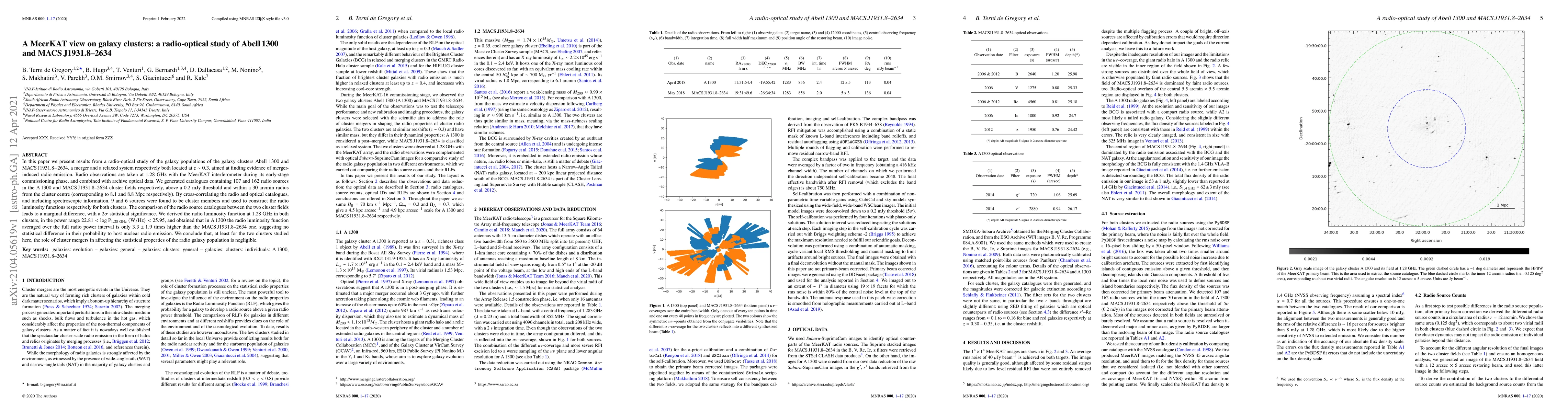 In this paper we present results from a radio-optical study of the galaxy populations of the galaxy clusters Abell 1300 and MACS J1931.8$-$2634, a merger and a relaxed system respectively both located at $z \sim 0.3$, aimed at finding evidence of merger-induced radio emission. Radio observations are taken at 1.28 GHz with the MeerKAT interferometer during its early-stage commissioning phase, and combined with archive optical data. We generated catalogues containing 107 and 162 radio sources in the A$~$1300 and MACS J1931.8--2634 cluster fields respectively, above a 0.2 mJy threshold and within a 30~arcmin radius from the cluster centre (corresponding to 8.1 and 8.8 Mpc respectively). By cross-correlating the radio and optical catalogues, and including spectroscopic information, 9 and 6 sources were found to be cluster members and used to construct the radio luminosity functions respectively for both clusters. The comparison of the radio source catalogues between the two cluster fields leads to a marginal difference, with a $2\sigma$ statistical significance. We derived the radio luminosity function at 1.28 GHz in both clusters, in the power range $22.81 < \rm {log~P_{1.28~GHz}~(W/Hz)} < 25.95$, and obtained that in A 1300 the radio luminosity function averaged over the full radio power interval is only $3.3 \pm 1.9$ times higher than the MACS J1931.8--2634 one, suggesting no statistical difference in their probability to host nuclear radio emission. We conclude that, at least for the two clusters studied here, the role of cluster mergers in affecting the statistical properties of the radio galaxy population is negligible.