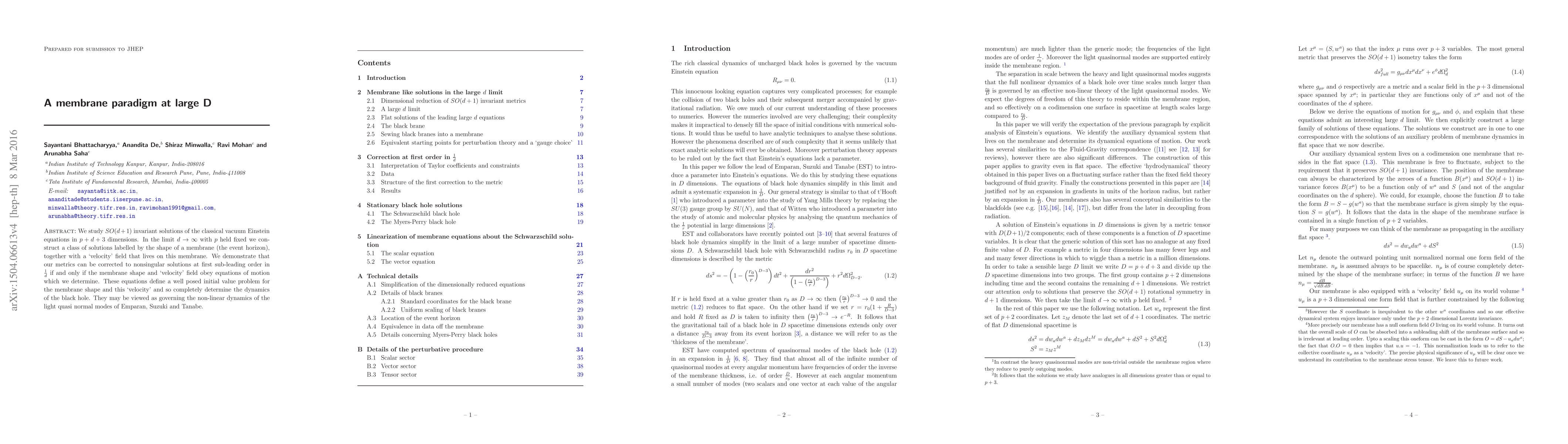 This paper constructs $SO(d+1)$ invariant solutions of the classical vacuum Einstein equations in $p+d+3$ dimensions, focusing on large $d$ limits. It identifies a class of solutions characterized by membrane shapes and associated velocity fields, determining equations of motion that dictate the dynamics of the black hole and govern the non-linear dynamics of light quasi-normal modes.