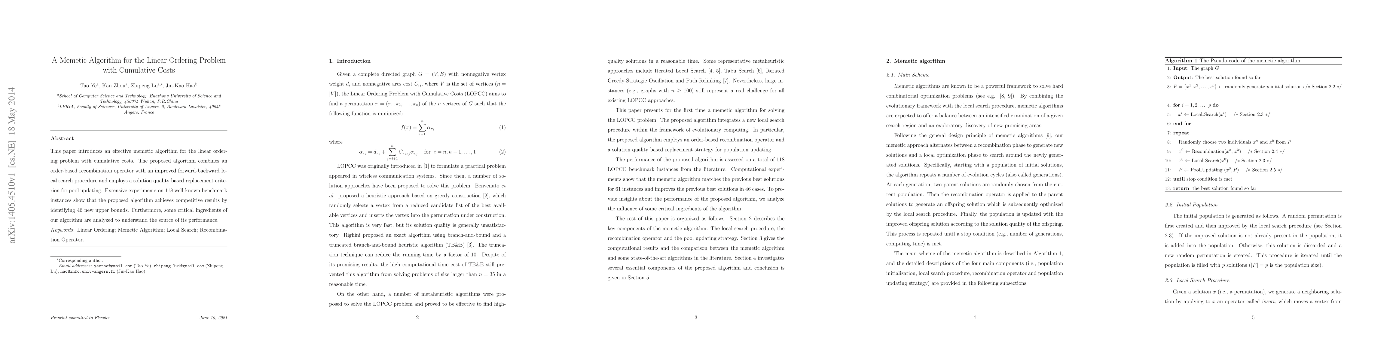 This paper presents a memetic algorithm for the linear ordering problem with cumulative costs, combining an order-based recombination operator with an enhanced local search procedure. Experimental results on 118 benchmarks demonstrate competitive performance and the identification of 46 new upper bounds.