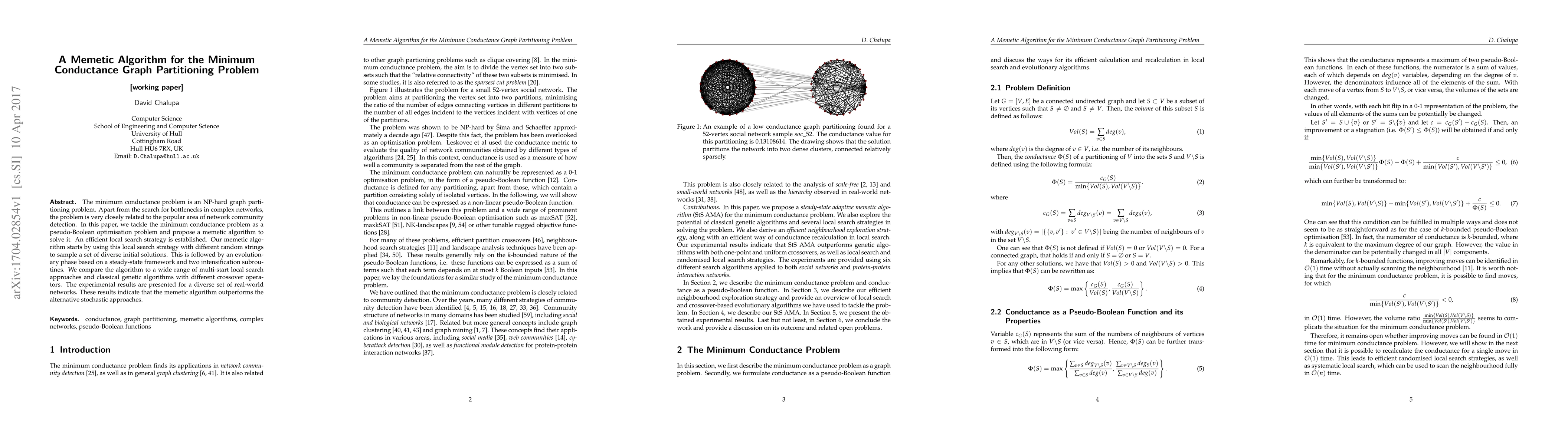 This paper proposes a memetic algorithm to solve the NP-hard minimum conductance graph partitioning problem, which is crucial for network community detection. The algorithm combines local search and evolutionary strategies, outperforming other stochastic and genetic approaches in experiments on real-world networks.