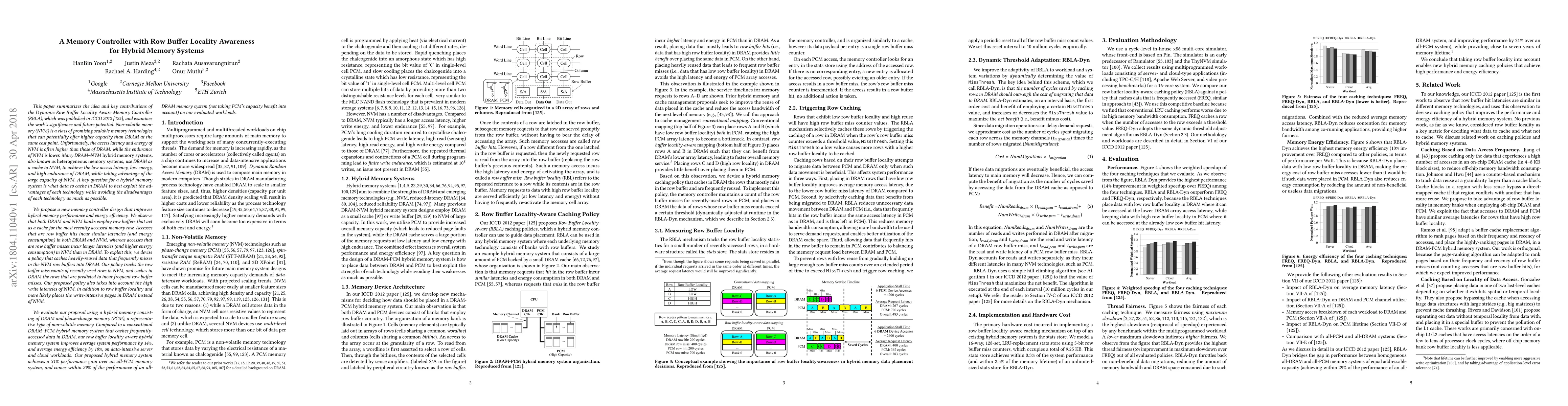 This paper proposes a memory controller design for hybrid memory systems that leverages row buffer locality awareness to improve performance and energy efficiency. The controller caches frequently missed rows in NVM into DRAM to reduce latency and energy consumption, while also considering NVM's high write latencies to place write-intensive data in DRAM.