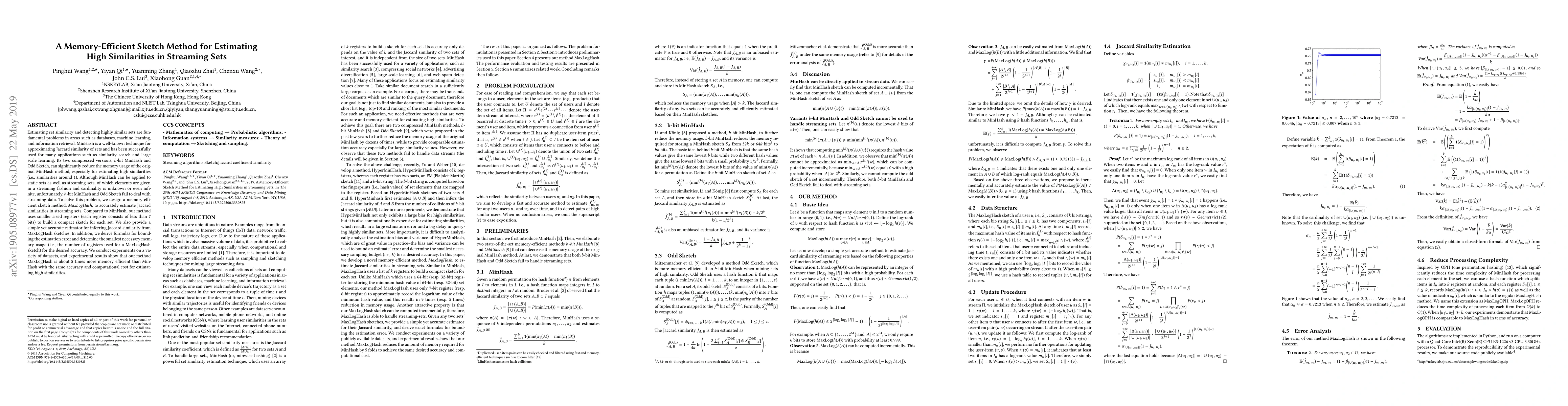 This paper introduces MaxLogHash, a memory-efficient sketch method for estimating high similarities in streaming sets, significantly reducing memory usage compared to MinHash. MaxLogHash uses smaller registers and provides an accurate estimator for Jaccard similarity, achieving about 5 times more memory efficiency while maintaining accuracy.