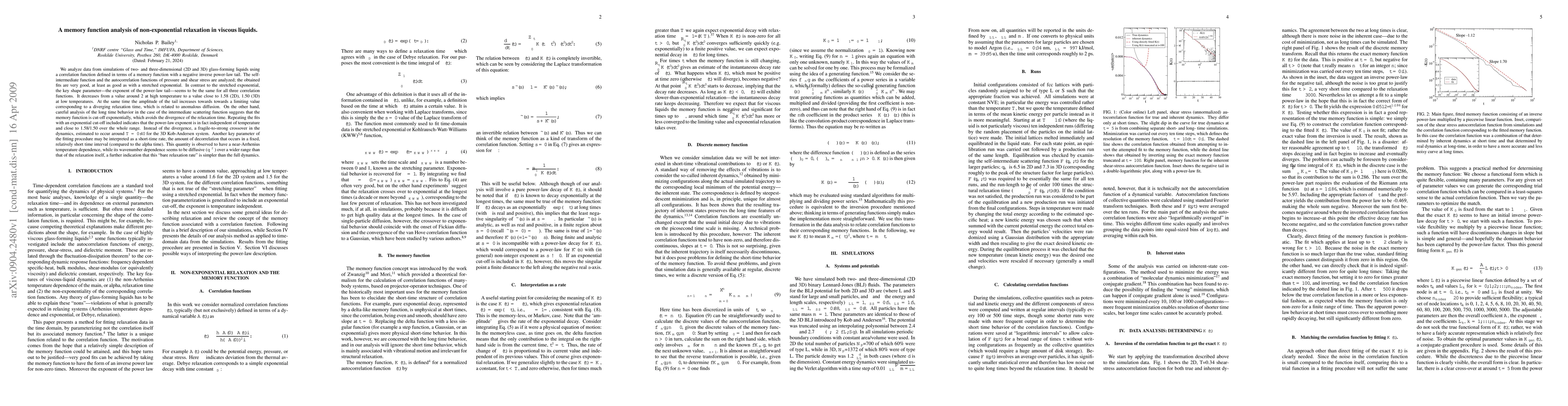 We analyze data from simulations of 2D and 3D glass-forming liquids using a correlation function defined in terms of a memory function with a negative inverse power-law tail. The self-intermediate function and the autocorrelation functions of pressure and shear stress are analyzed; the obtained fits are very good, at least as good as with a stretched exponential. In contrast to the stretched exponential, the key shape parameter--the exponent of the power-law tail--seems to be the same for all three correlation functions. It decreases from a value around 2 at high temperature to a value close to 1.58 (2D), 1.50 (3D) at low temperatures. The amplitude of the tail increases towards towards a value corresponding to a diverging relaxation time, which is related to anomalous diffusion. On the other hand, careful analysis of the long time behavior in the case of suggests that the memory function is cut-off exponentially, which avoids the divergence of the relaxation time. Repeating the fits with an exponential cut-off included indicates that the power-law exponent is in fact independent of temperature and close to 1.58/1.50 over the whole range. Instead of the divergence, a fragile-to-strong crossover in the dynamics, estimated to occur around $T=0.40$ for the 3D Kob-Andersen system. Another key parameter of the fitting procedure may be interpreted as a short-time rate, the amount of decorrelation that occurs in a fixed, relatively short time interval (compared to the alpha time). This quantity is observed to have a near-Arrhenius temperature dependence, while its wavenumber dependence seems to be diffusive ($q^{-2}$) over a wider range than that of the relaxation itself, a further indication that this "bare relaxation rate" is simpler than the full dynamics.