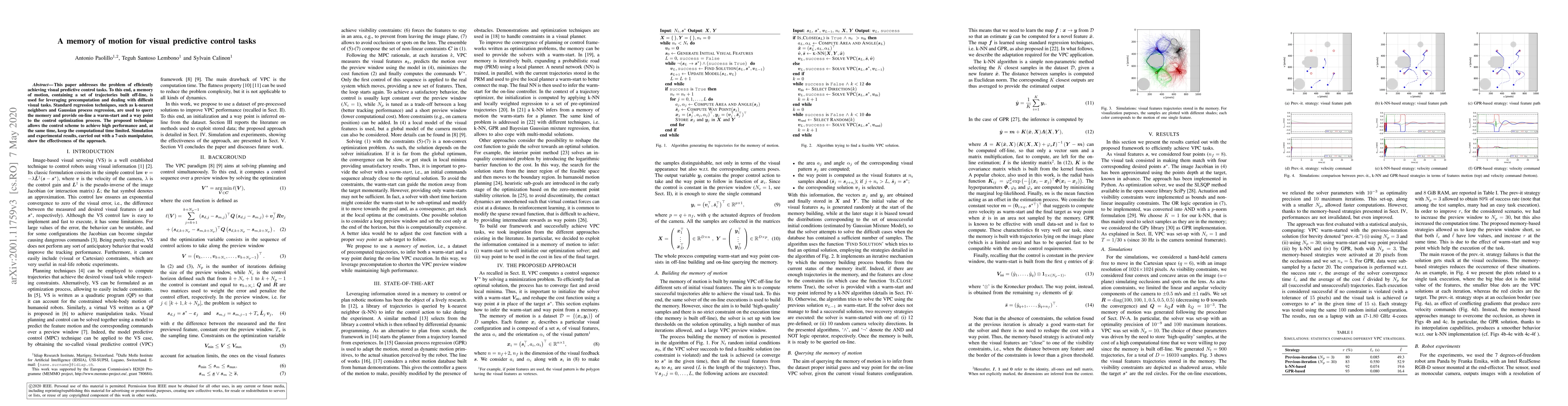 This paper addresses the problem of efficiently achieving visual predictive control tasks. To this end, a memory of motion, containing a set of trajectories built off-line, is used for leveraging precomputation and dealing with difficult visual tasks. Standard regression techniques, such as k-nearest neighbors and Gaussian process regression, are used to query the memory and provide on-line a warm-start and a way point to the control optimization process. The proposed technique allows the control scheme to achieve high performance and, at the same time, keep the computational time limited. Simulation and experimental results, carried out with a 7-axis manipulator, show the effectiveness of the approach.