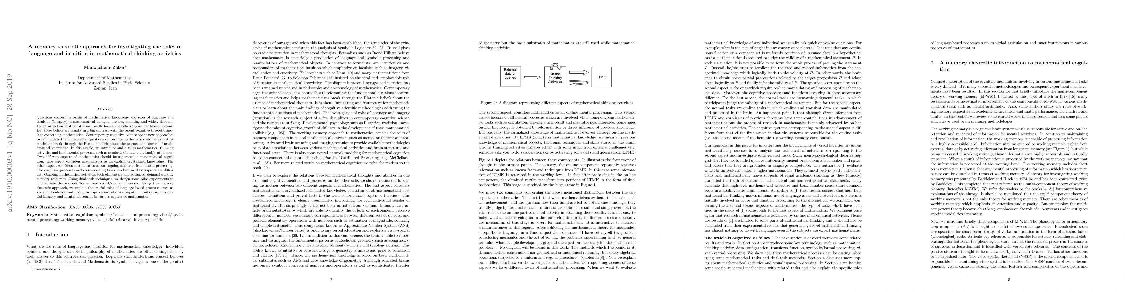 This research paper explores how language and intuition play roles in mathematical thinking activities, using a memory theoretic approach to investigate the relationship between cognitive processes and mathematical knowledge.