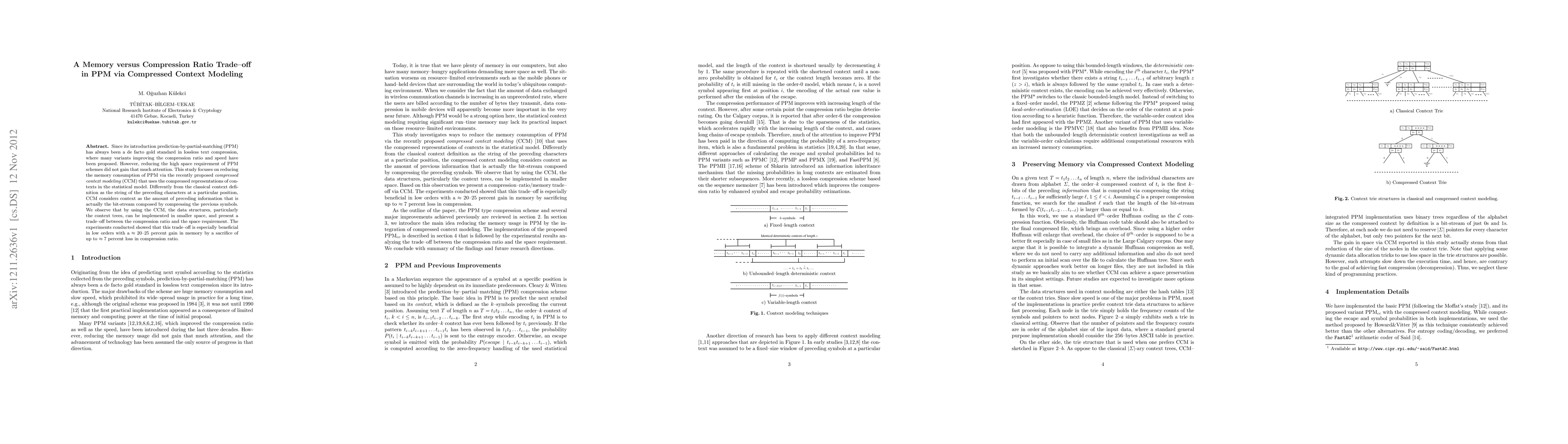 This study explores reducing memory consumption in PPM via compressed context modeling (CCM), which represents contexts as compressed bit streams instead of strings. The results show a trade-off between compression ratio and memory usage, with a notable 20-25% memory gain at the cost of up to 7% loss in compression ratio, particularly effective in lower orders.