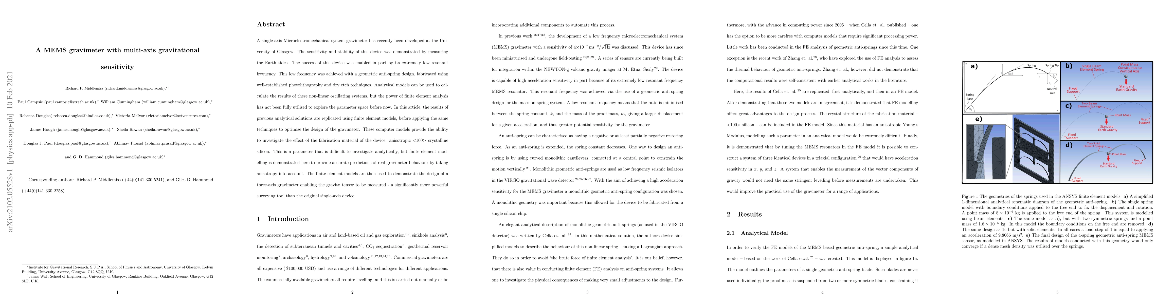A single-axis Microelectromechanical system gravimeter has recently been developed at the University of Glasgow. The sensitivity and stability of this device was demonstrated by measuring the Earth tides. The success of this device was enabled in part by its extremely low resonant frequency. This low frequency was achieved with a geometric anti-spring design, fabricated using well-established photolithography and dry etch techniques. Analytical models can be used to calculate the results of these non-linear oscillating systems, but the power of finite element analysis has not been fully utilised to explore the parameter space before now. In this article, the results of previous analytical solutions are replicated using finite element models, before applying the same techniques to optimise the design of the gravimeter. These computer models provide the ability to investigate the effect of the fabrication material of the device: anisotropic <100> crystalline silicon. This is a parameter that is difficult to investigate analytically, but finite element modelling is demonstrated here to provide accurate predictions of real gravimeter behaviour by taking anisotropy into account. The finite element models are then used to demonstrate the design of a three-axis gravimeter enabling the gravity tensor to be measured - a significantly more powerful surveying tool than the original single-axis device.