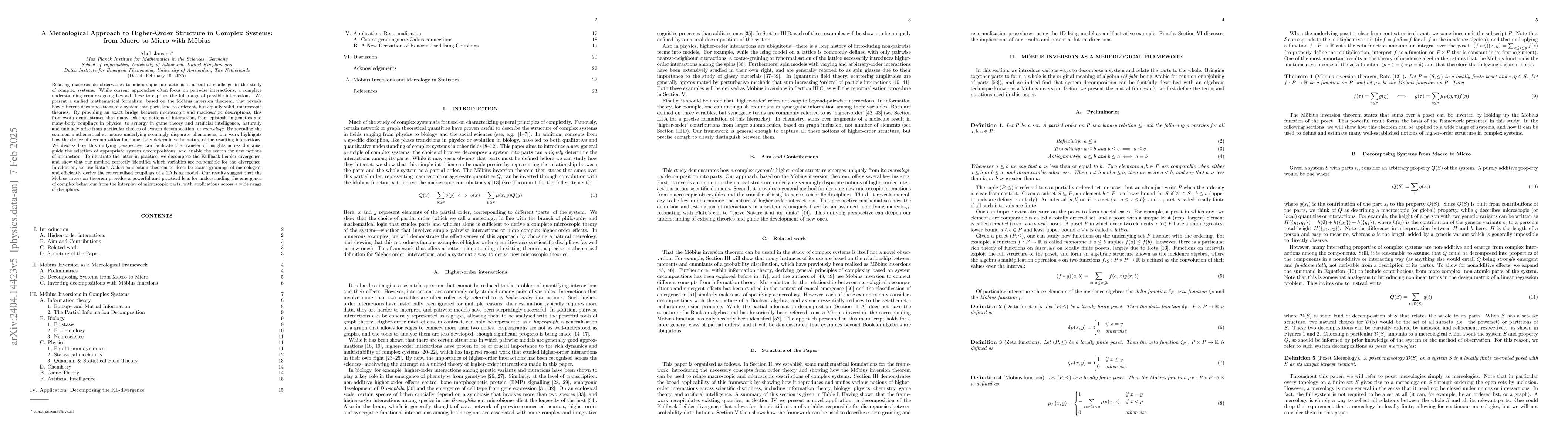 Relating microscopic interactions to macroscopic observables is a central challenge in the study of complex systems. Addressing this question requires understanding both pairwise and higher-order interactions, but the latter are less well understood. We present a unified mathematical formalism for deriving higher-order interactions from macroscopic observables, relative to a chosen decomposition of the system into its parts. Applying this framework to a diverse range of systems, we demonstrate that many existing notions of higher-order interactions, from epistasis in genetics and many-body couplings in physics, to synergy in game theory and artificial intelligence, naturally and uniquely arise from an appropriate mereological decomposition through the M\"obius inversion theorem. By revealing the common mathematical structure underlying seemingly disparate phenomena, our work highlights the fundamental role of decomposition choice in the definition and estimation of higher-order interactions. We discuss how this unifying perspective can facilitate the transfer of insights across domains, guide the selection of appropriate system decompositions, and enable the search for new notions of interaction. To illustrate how this works in practice, we derive a new decomposition of the Kullback-Leibler divergence, and show that it correctly disentangles divergences among the variables of simulated spin models. Our results suggest that the M\"obius inversion theorem provides a powerful and practical lens for understanding the emergence of complex behaviour from the interplay of microscopic parts, with applications across a wide range of disciplines.
