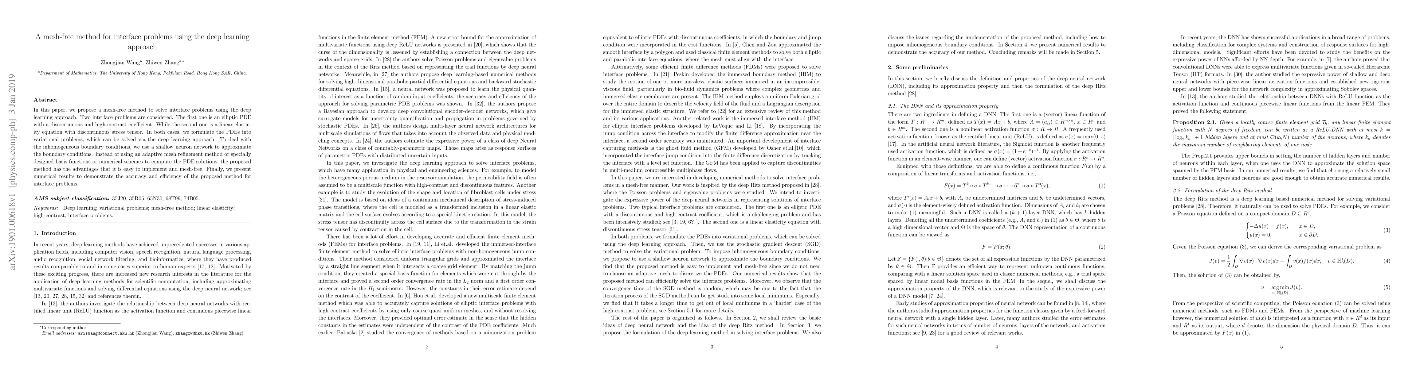 This paper introduces a mesh-free method leveraging deep learning to solve interface problems, specifically elliptic PDEs with high-contrast discontinuities and linear elasticity equations with discontinuous stress tensors. The method uses a shallow neural network to approximate boundary conditions without requiring adaptive mesh refinement or specialized basis functions.