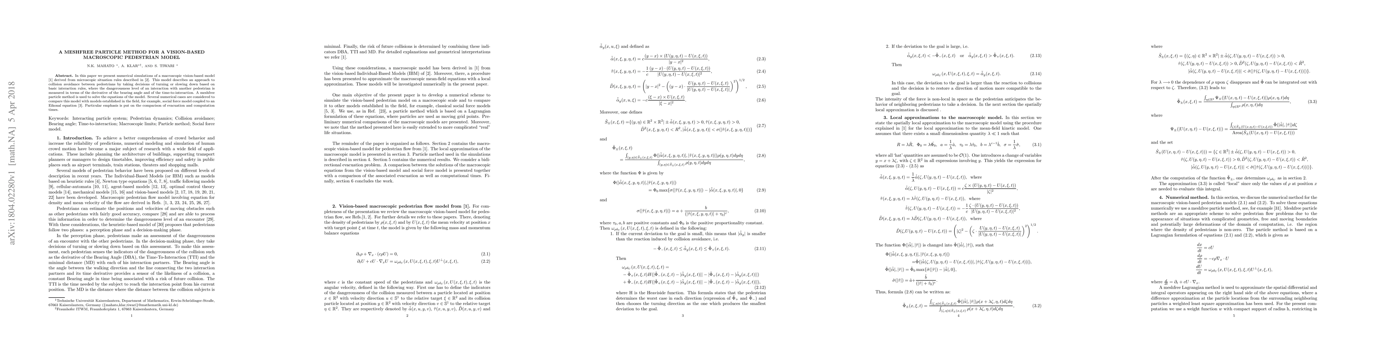 In this paper we present numerical simulations of a macroscopic vision-based model [1] derived from microscopic situation rules described in [2]. This model describes an approach to collision avoidance between pedestrians by taking decisions of turning or slowing down based on basic interaction rules, where the dangerousness level of an interaction with another pedestrian is measured in terms of the derivative of the bearing angle and of the time-to-interaction. A meshfree particle method is used to solve the equations of the model. Several numerical cases are considered to compare this model with models established in the field, for example, social force model coupled to an Eikonal equation [3]. Particular emphasis is put on the comparison of evacuation and computation times. References 1. Degond P., Appert-Rolland C., Pettere J., Theraulaz G., Vision-based macroscopic pedestrian models, Kinetic and Related models, AIMs 6(4), 809-839 (2013) 2. Ondrej J., Pettere J., Olivier A.H., Donikian S., A synthetic-vision based steering approach for crowd simulation, ACM Transactions on Graphics, 29(4), Article 123 (2010) 3. Etikyala R., Gottlich S., Klar A., Tiwari S., Particle methods for pedestrian flow models: From microscopic to nonlocal continuum models, Mathematical Models and Methods in Applied Sciences, 20(12), 2503-2523 (2014)