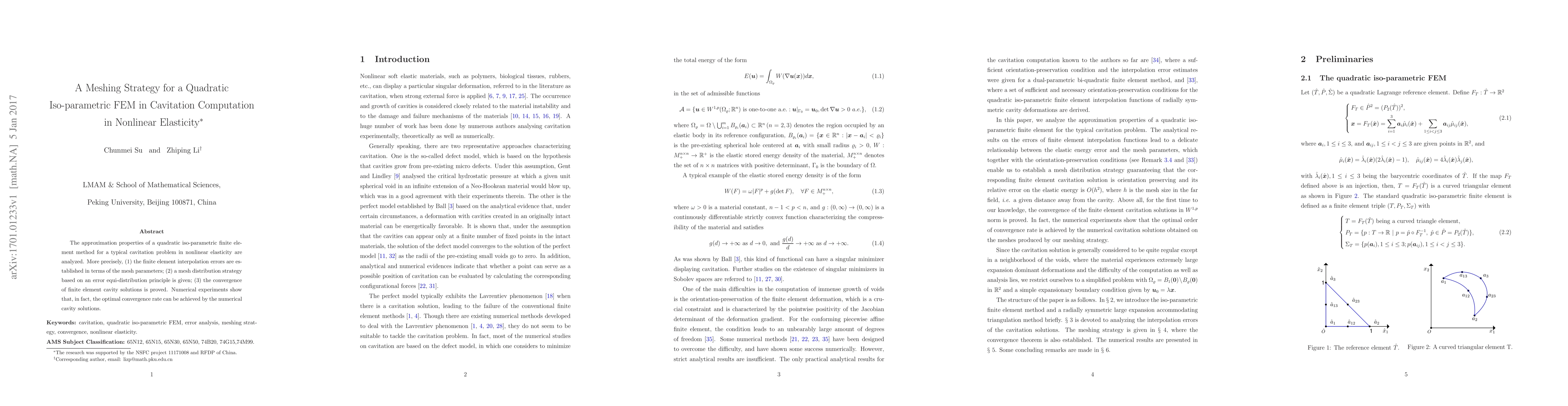 This paper analyzes the quadratic iso-parametric finite element method for cavitation problems in nonlinear elasticity, establishing finite element interpolation errors and proposing a mesh distribution strategy based on error equi-distribution. The convergence of cavity solutions is proven, and numerical experiments confirm optimal convergence rates.