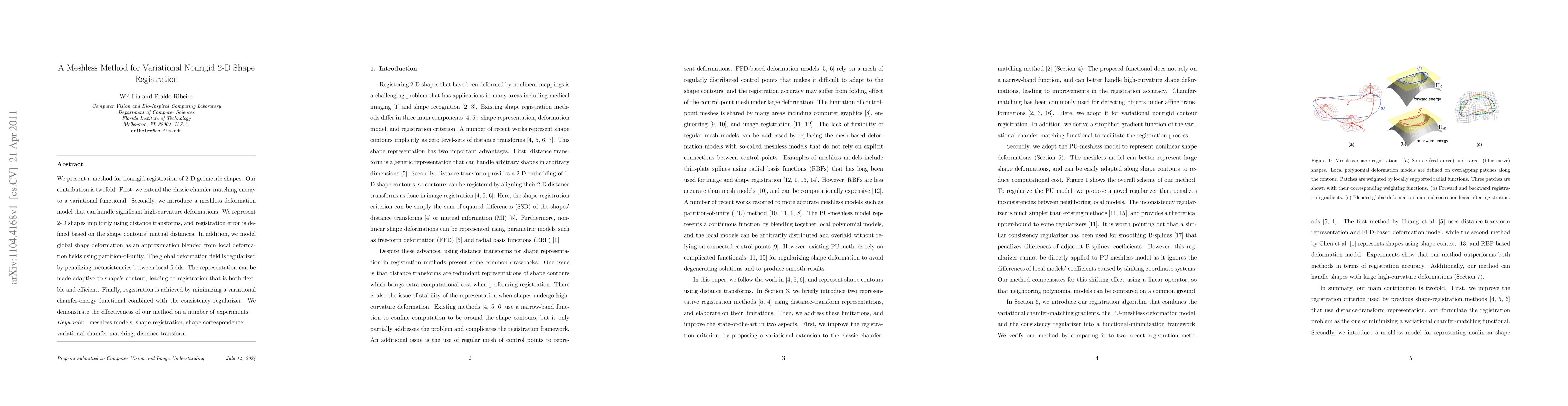 This paper proposes a meshless method for nonrigid registration of 2-D shapes, extending chamfer-matching energy into a variational functional and introducing a deformation model that handles high-curvature deformations. The method uses distance transforms and partition-of-unity for adaptive, flexible, and efficient registration.