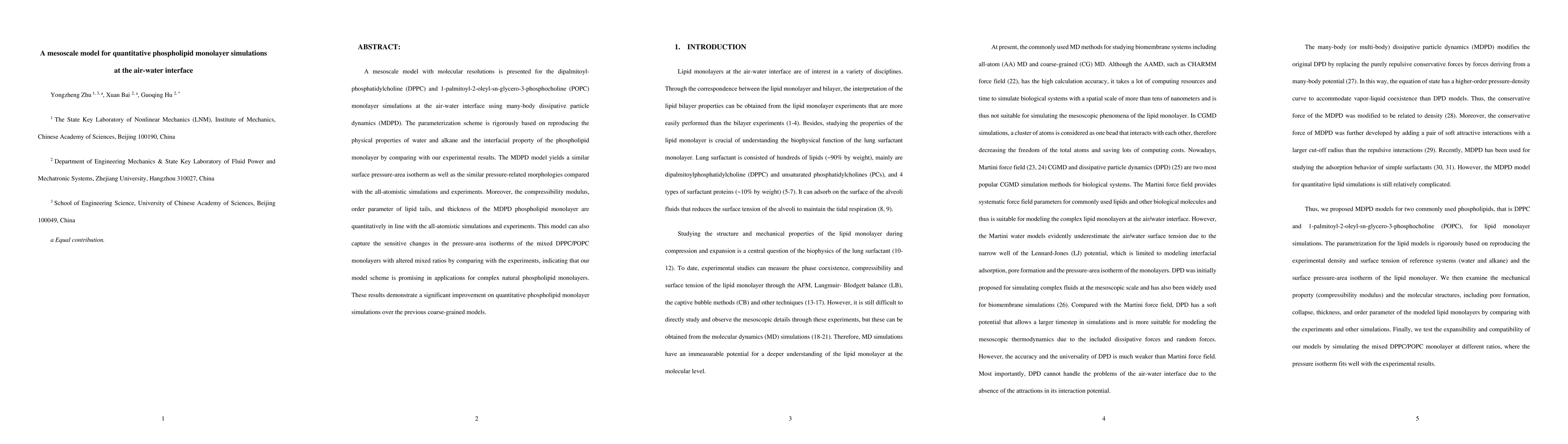 This paper introduces a mesoscale model for simulating phospholipid monolayers at the air-water interface using many-body dissipative particle dynamics, achieving molecular resolution. The model accurately reproduces the physical properties of water and alkane, and the interfacial properties of phospholipids, showing good agreement with experimental results and all-atomistic simulations.