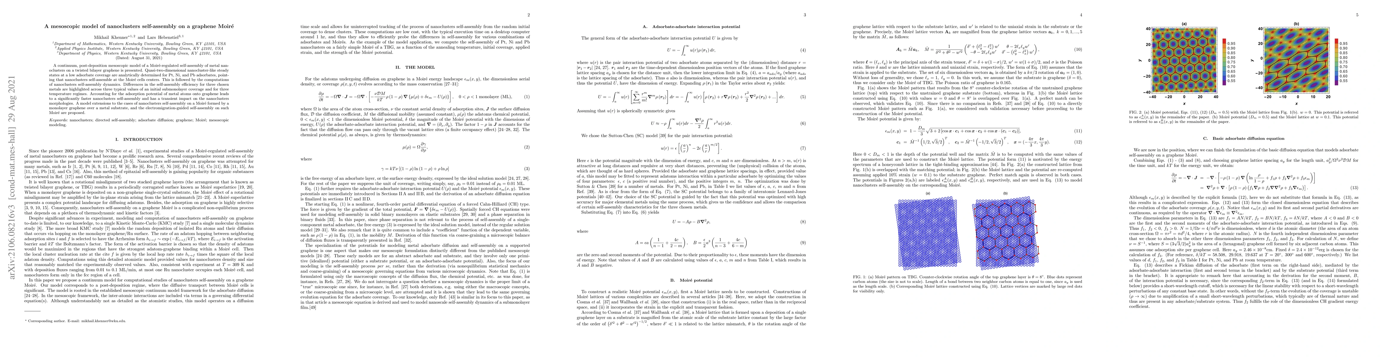 This paper presents a mesoscopic model for the self-assembly of metal nanoclusters on a twisted bilayer graphene, showing that clusters preferentially form at Moir\'e cell centers. It highlights the differences in self-assembly efficiency for Pt, Ni, and Pb under various coverages and temperature conditions, and proposes extensions to other graphene-based Moir\'e systems.