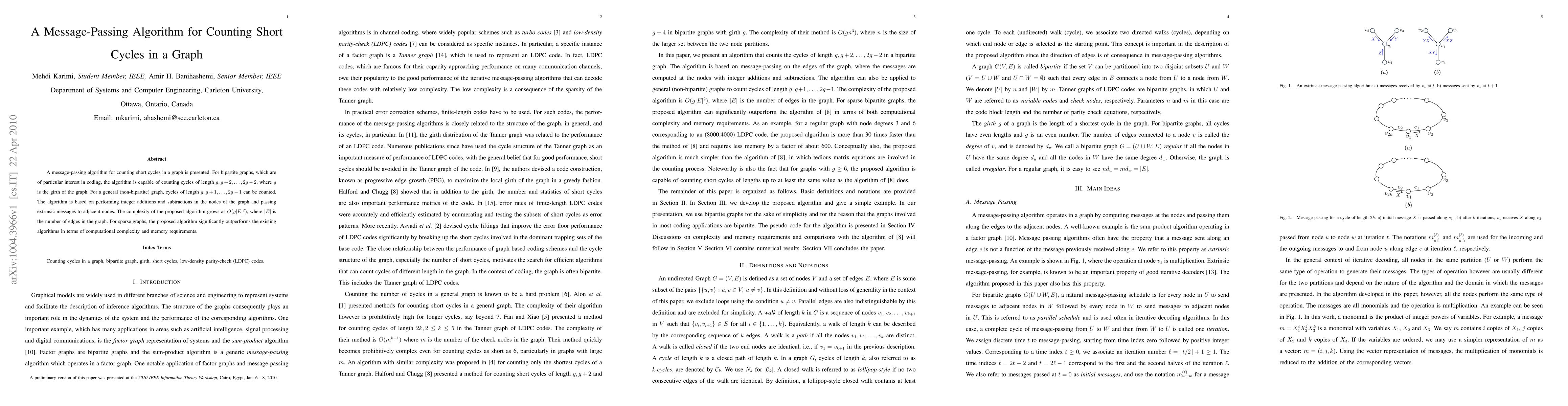 This paper introduces a message-passing algorithm for efficiently counting short cycles in both bipartite and general graphs, with complexity $O(g|E|^2)$. It outperforms existing methods for sparse graphs in computational efficiency and memory usage.