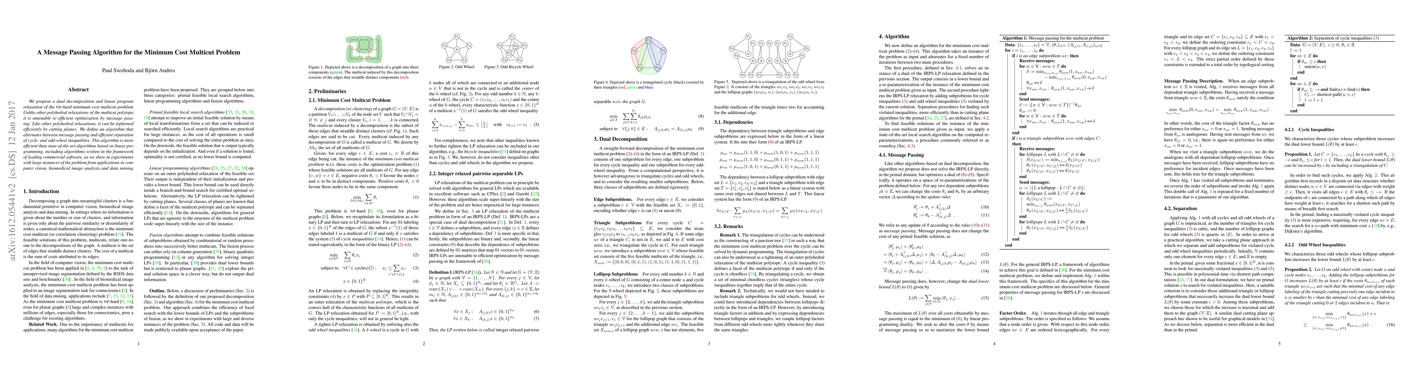 This paper proposes a message passing algorithm for solving the minimum cost multicut problem efficiently through dual decomposition and linear programming. The algorithm alternates between message passing and cutting plane separation, outperforming existing linear programming-based methods in large-scale applications.